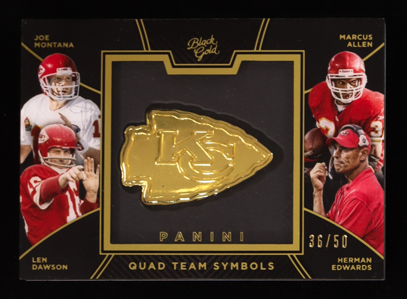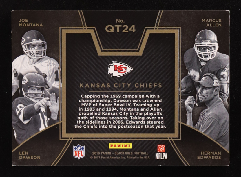 Len Dawson / Marcus Allen / Herman Edwards / Joe Montana 2016 Panini Black Gold Quad Team Symbols #24 #36/50