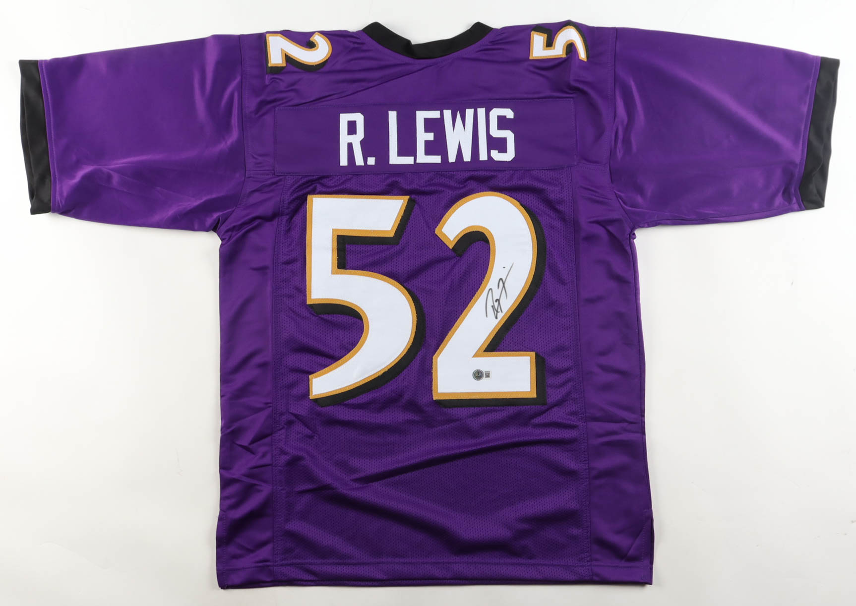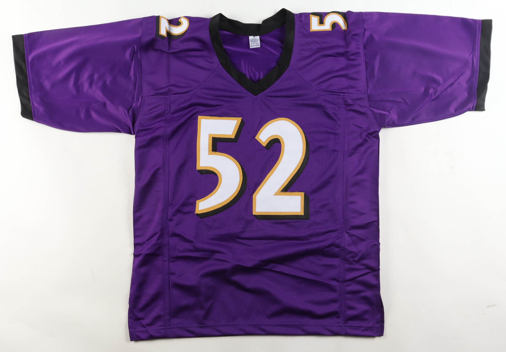 Custom jersey with everything sewn on, size XL. Hand-signed by Ray Lewis (HOF)