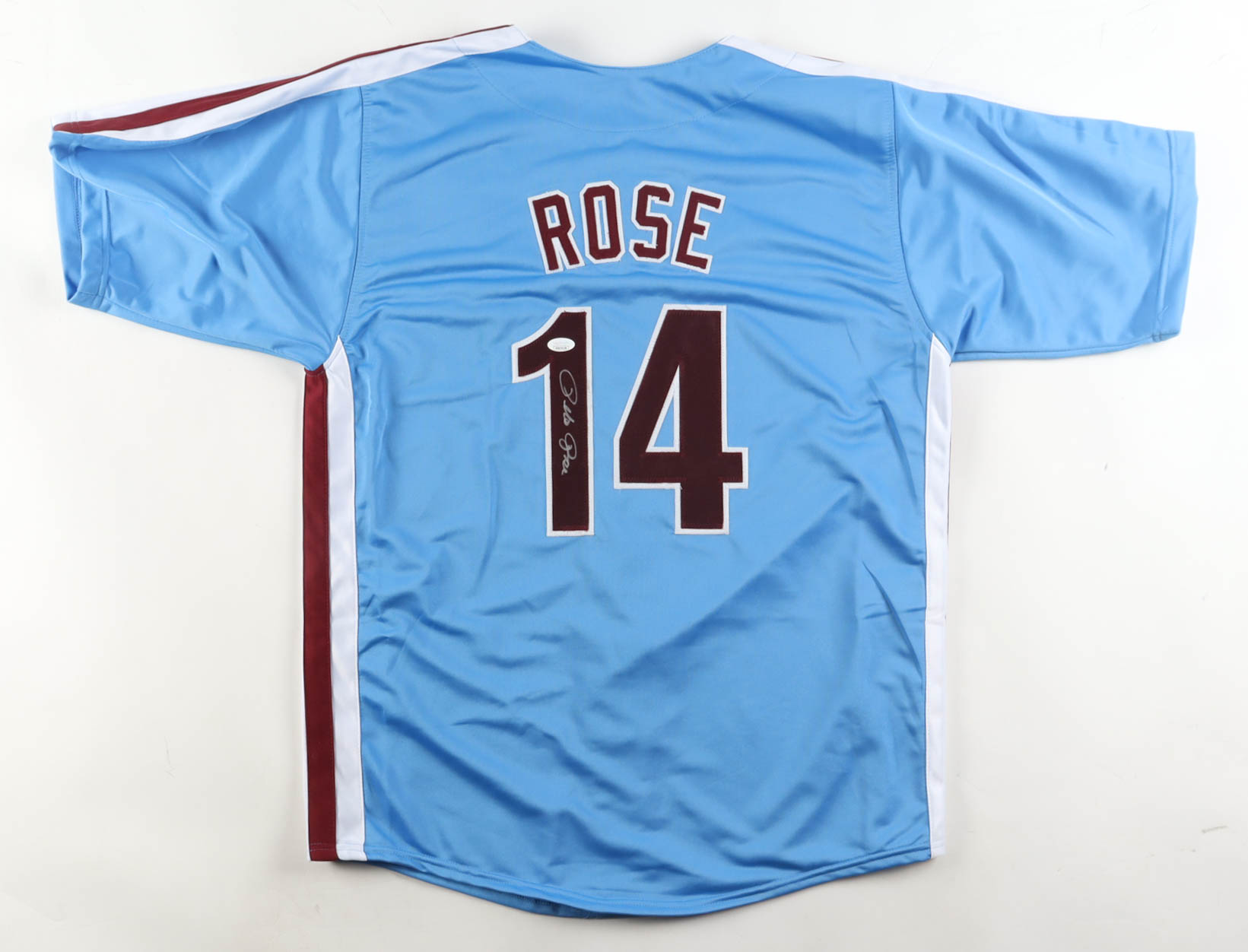 Custom jersey with everything sewn on, size XL. Hand-signed by Pete Rose (D. 2024).