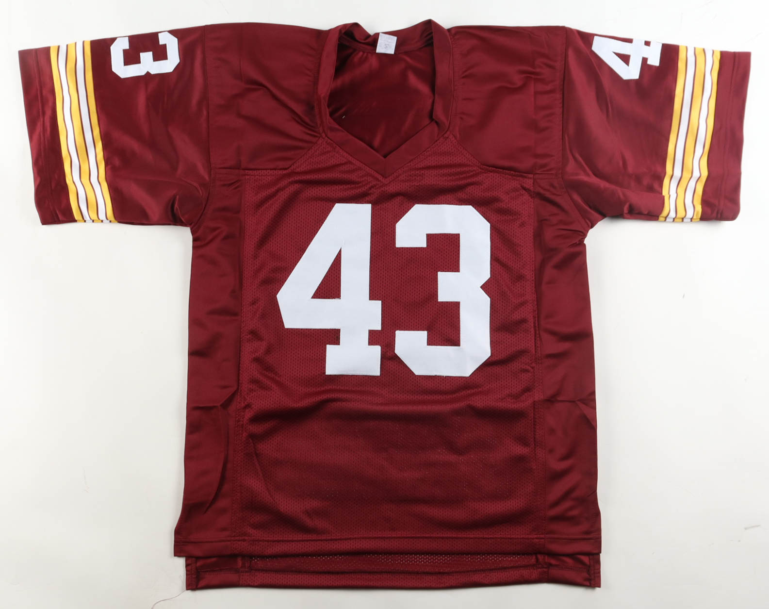 Custom jersey. Everything is sewn on, size XL. Hand-signed by Larry Brown. Brown's career highlights have been custom stitched onto the back of the jersey below the reverse numbers.
