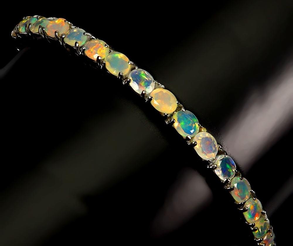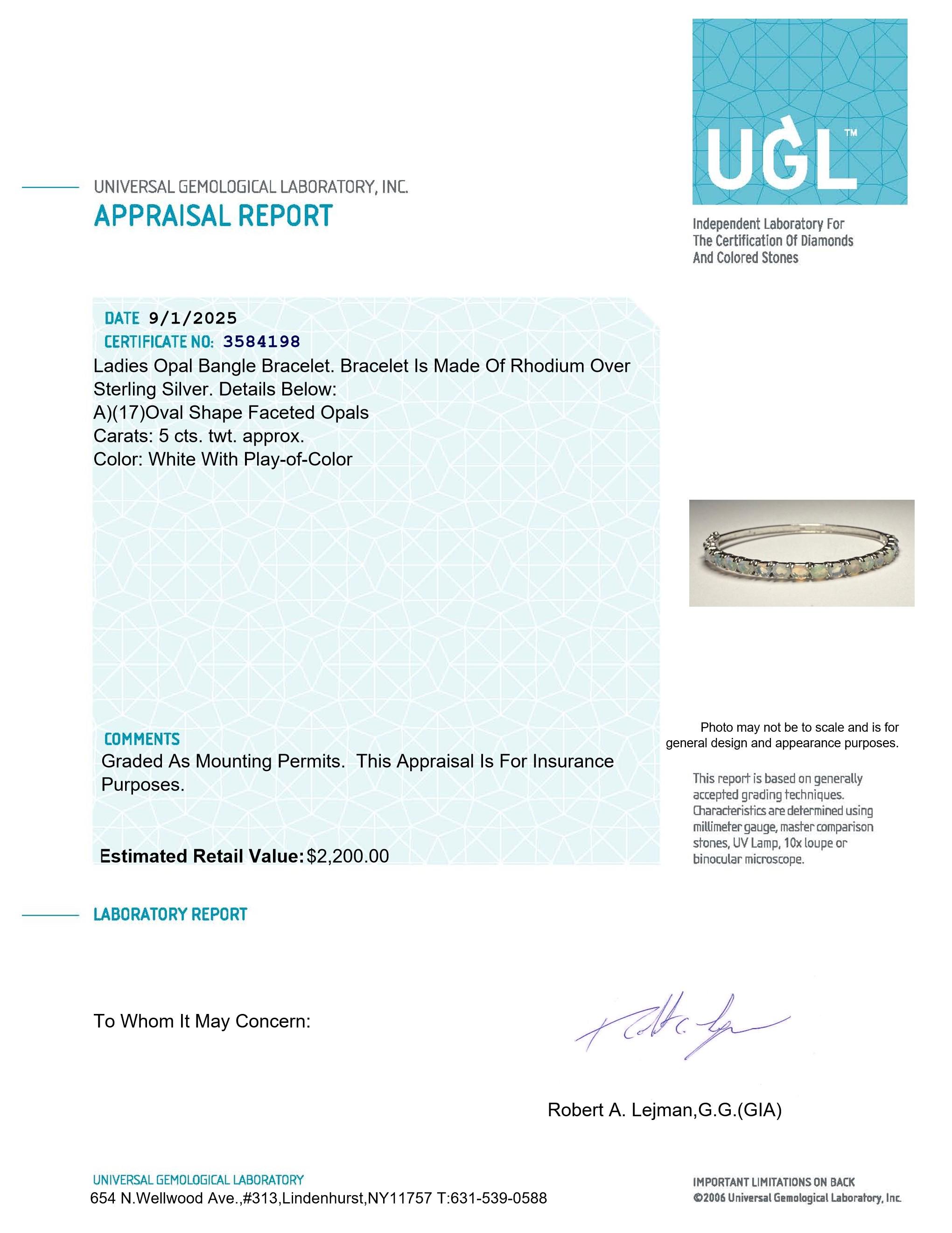 Offered for sale is a new ladies opal bangle bracelet crafted in rhodium over sterling silver. This elegant bracelet features multiple oval faceted opals displaying beautiful play-of-color throughout. A classic and refined design suitable for daily wear or special occasions. Includes UGL appraisal for insurance purposes.