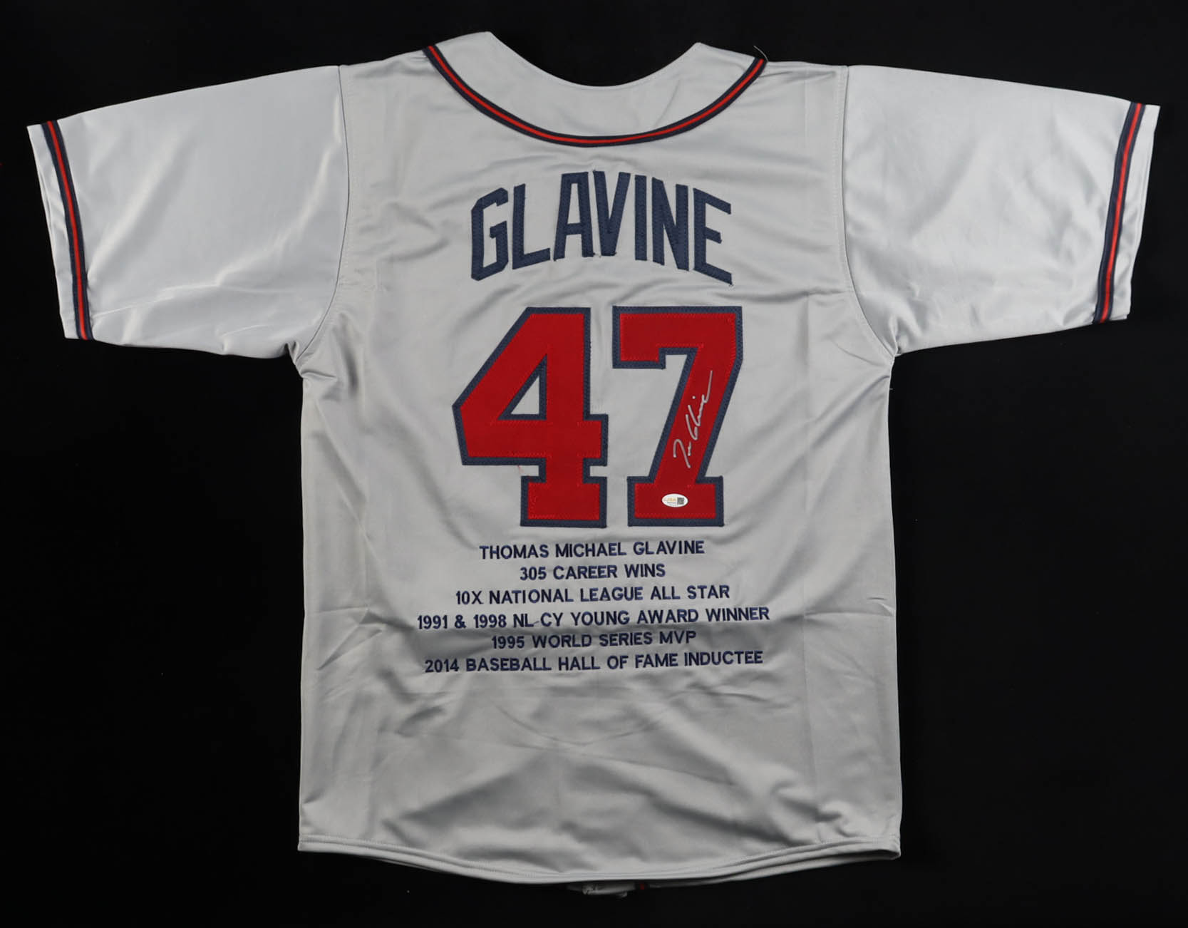 Tom Glavine Signed Career Highlight Stat Jersey (JSA)