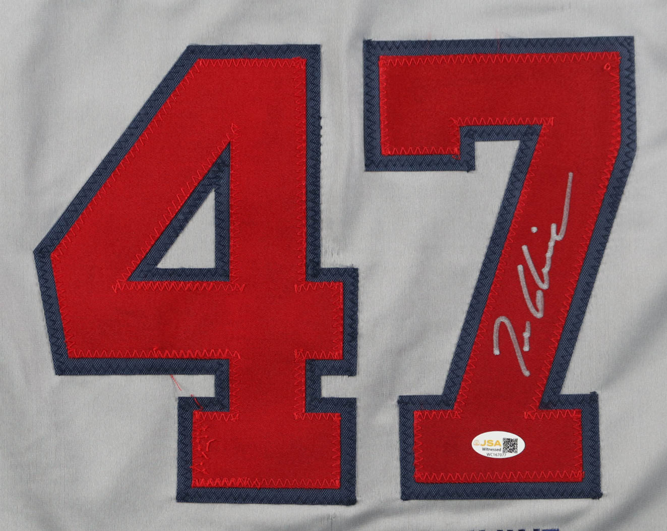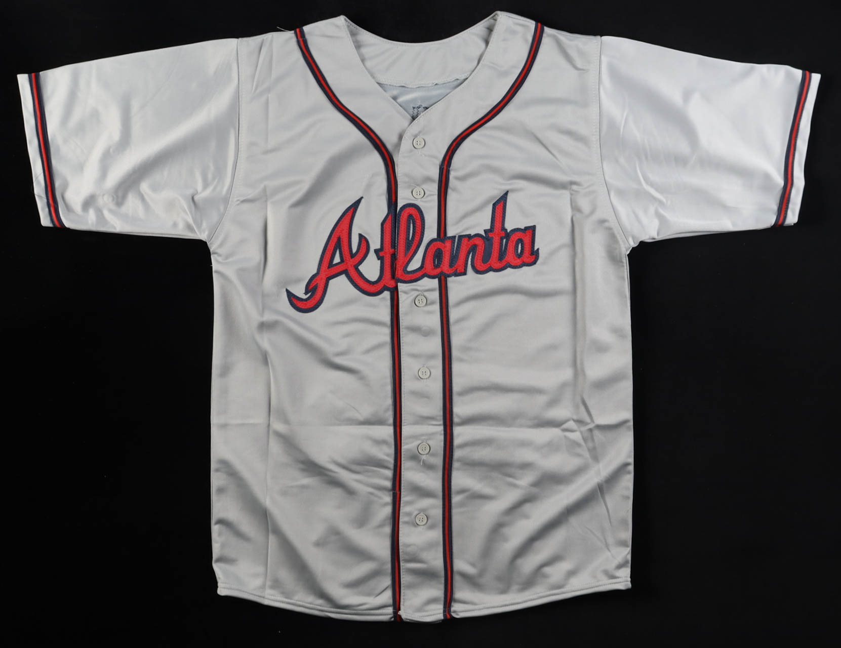 Custom jersey with everything sewn on, size XL. Hand-signed by Tom Glavine (HOF). Glavine's career highlights have been custom stitched onto the back of the jersey below the reverse numbers.
