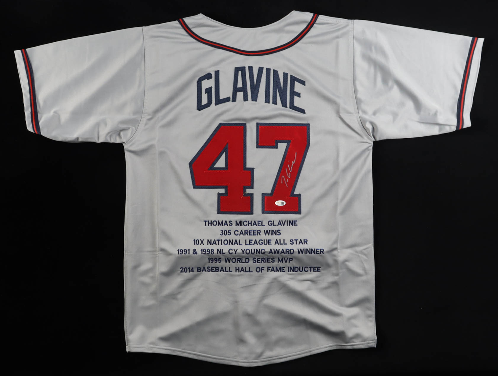 Custom jersey with everything sewn on, size XL. Hand-signed by Tom Glavine (HOF). Glavine's career highlights have been custom stitched onto the back of the jersey below the reverse numbers.