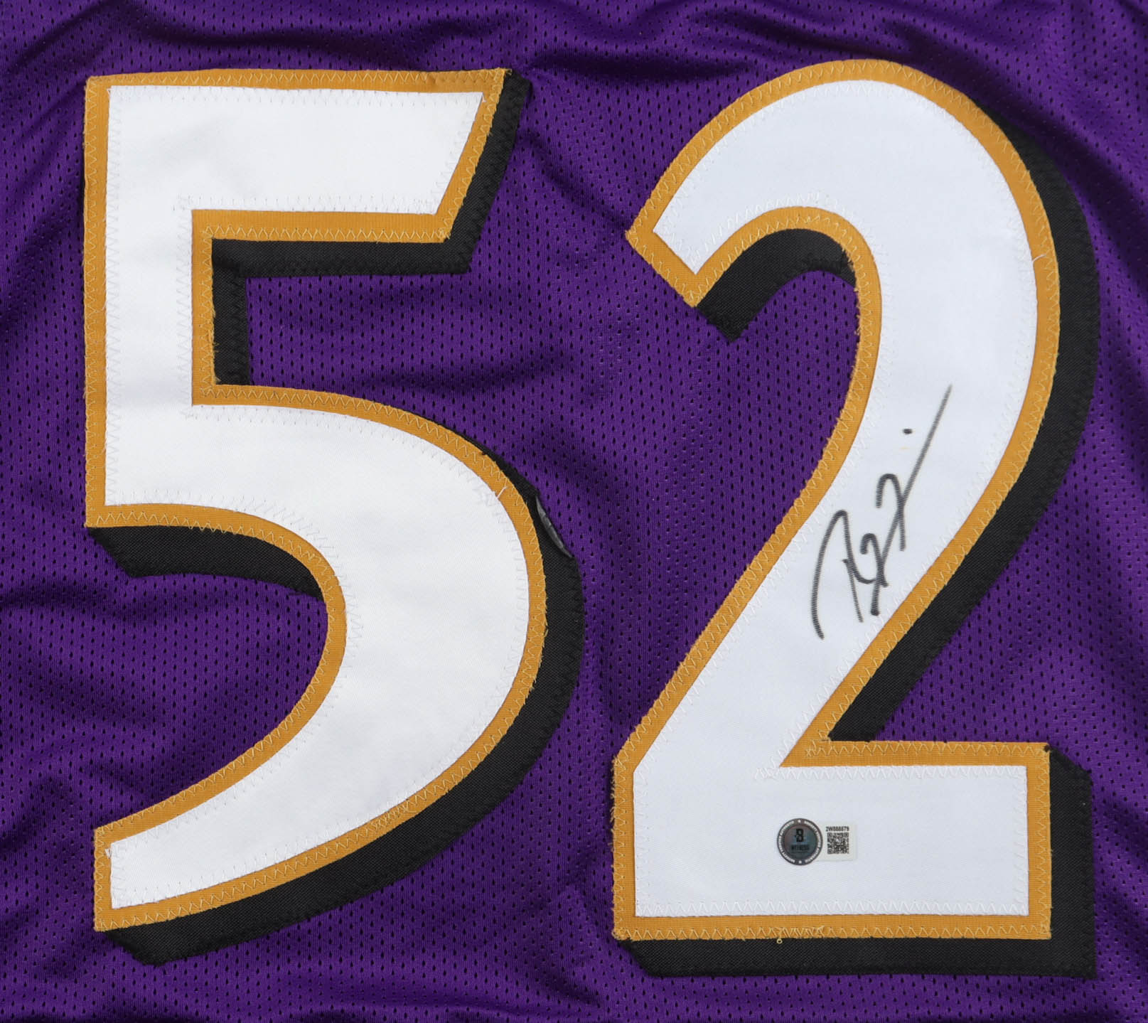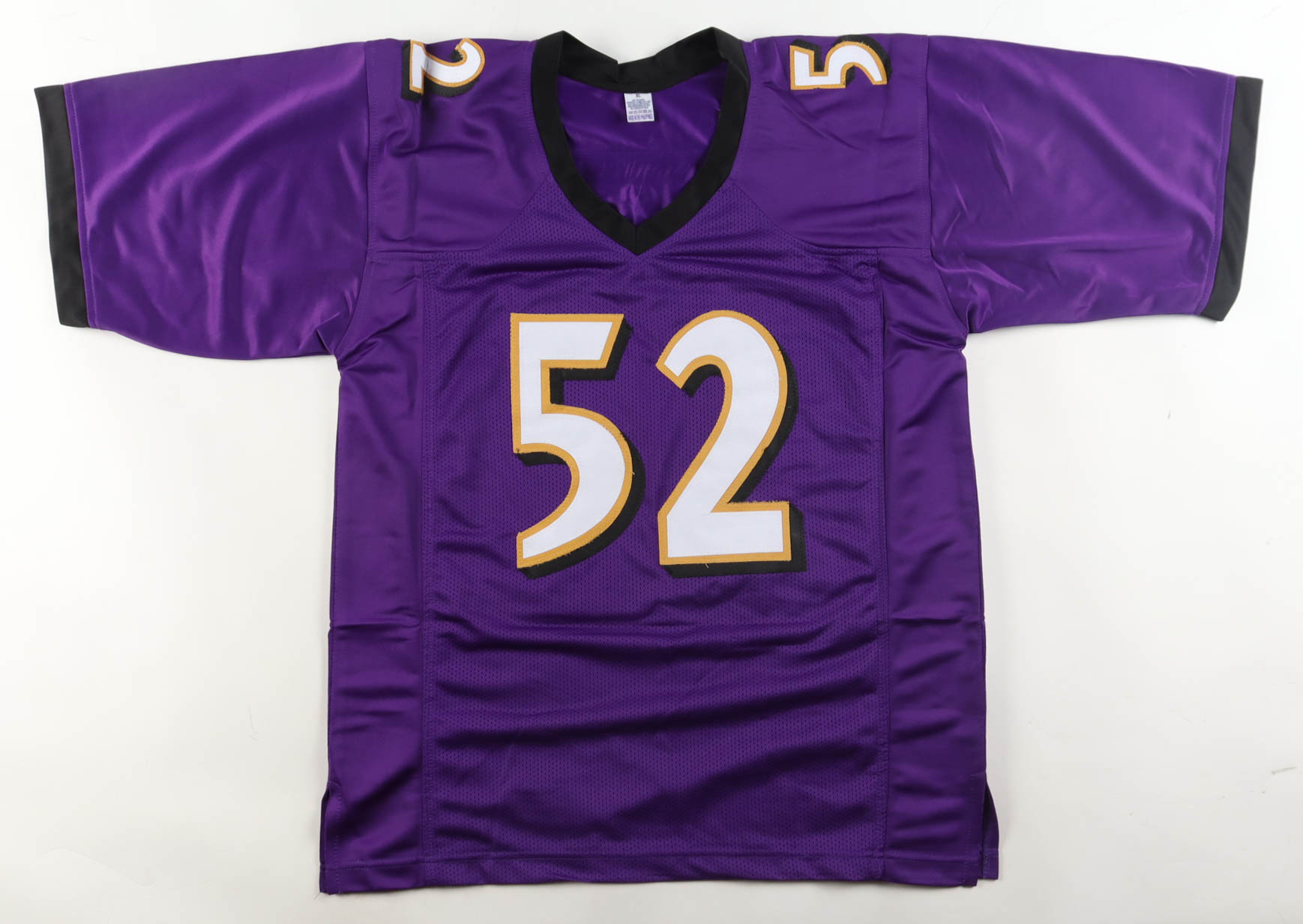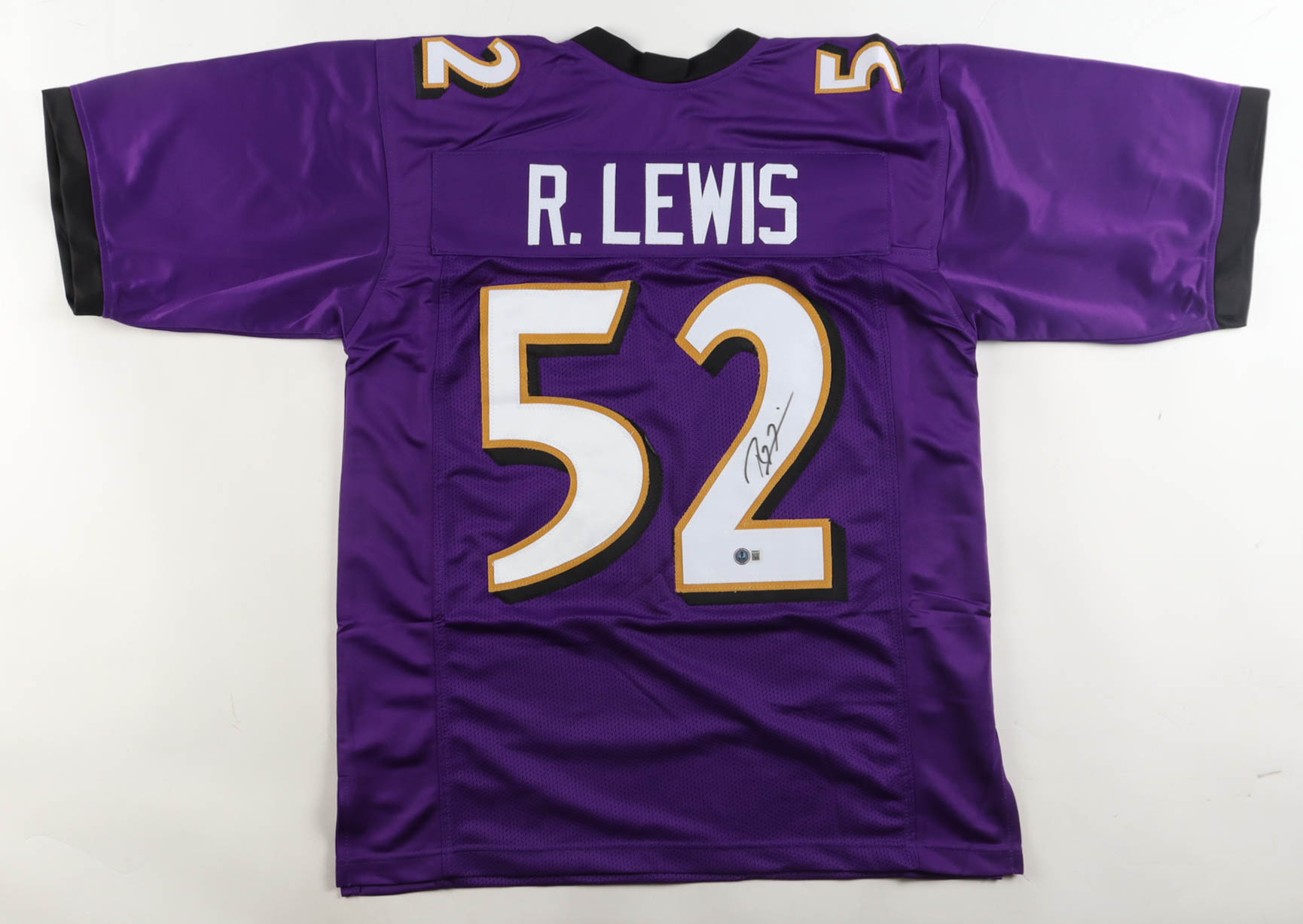 Custom jersey with everything sewn on, size XL. Hand-signed by Ray Lewis (HOF)