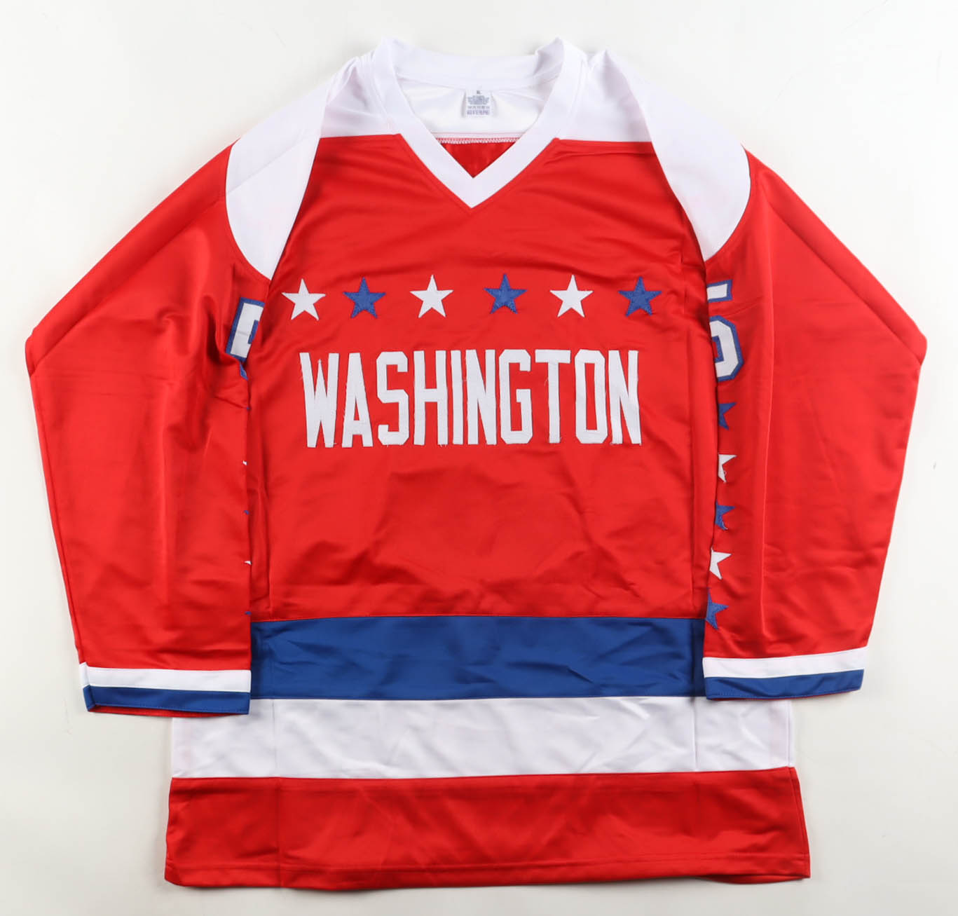 Custom jersey. Everything is sewn on, size XL. Has been hand-signed and inscribed by Rod Langway (HOF)