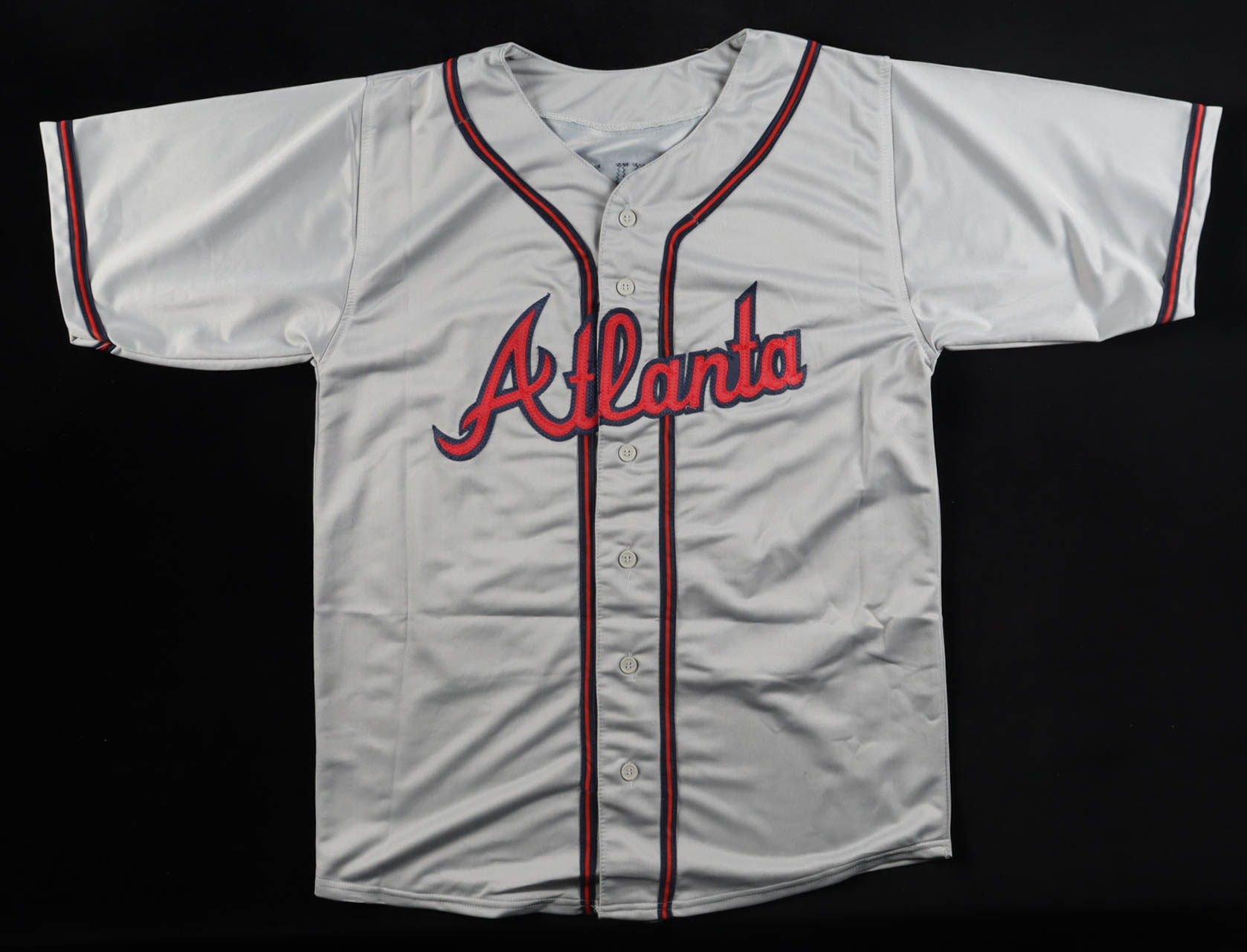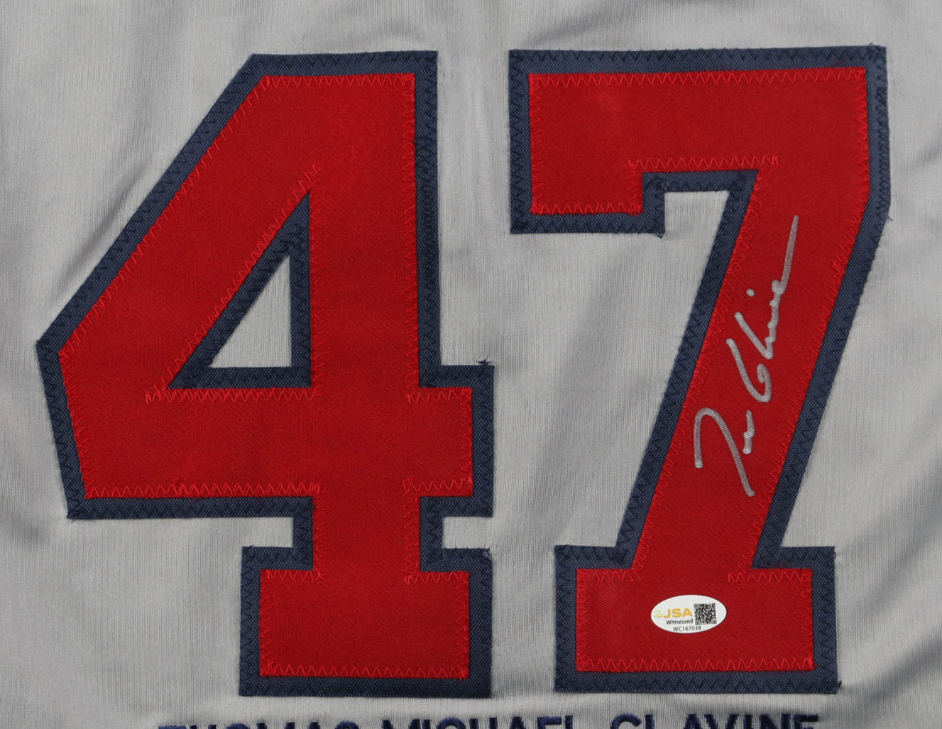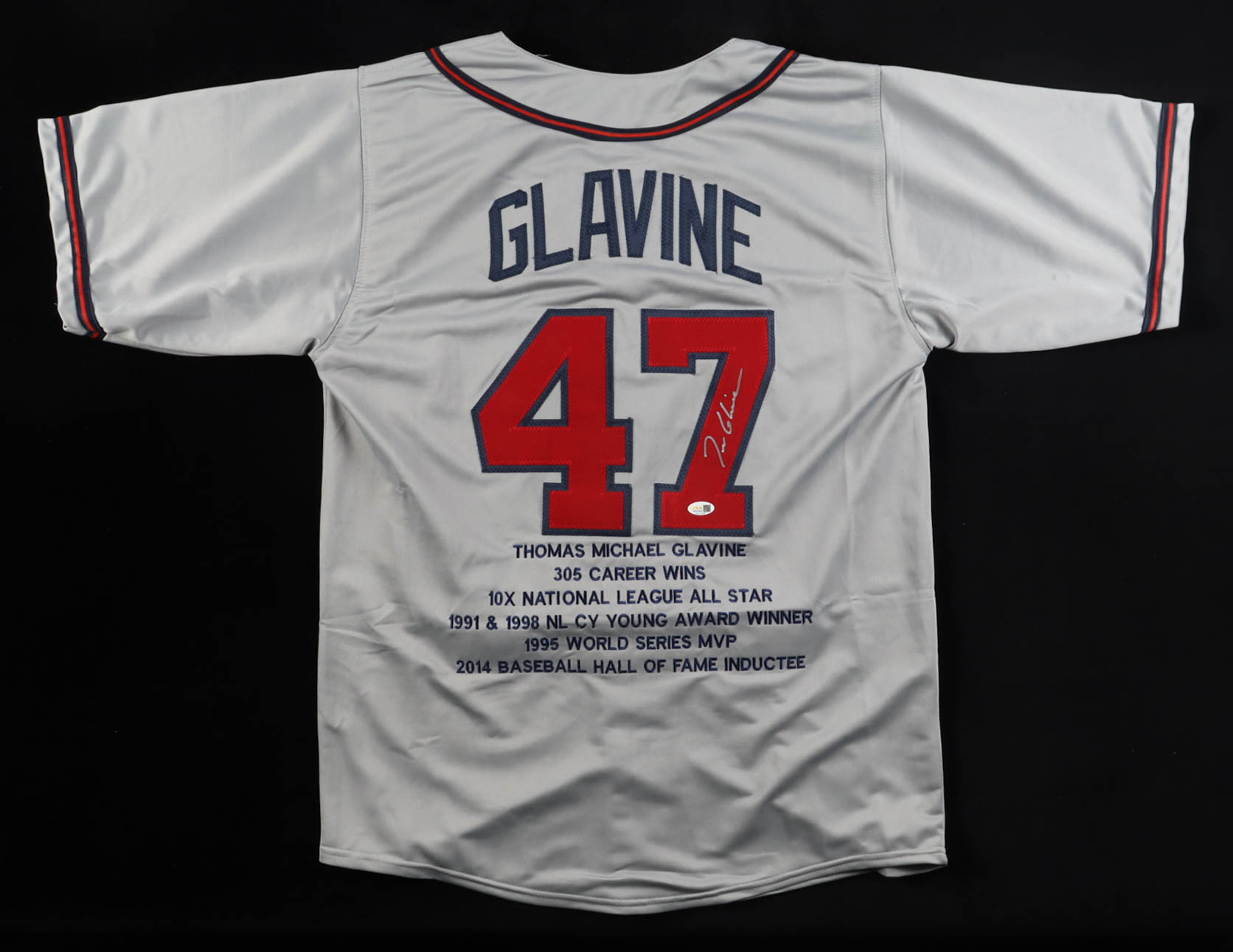 Custom jersey with everything sewn on, size XL. Hand-signed by Tom Glavine (HOF). Glavine's career highlights have been custom stitched onto the back of the jersey below the reverse numbers.