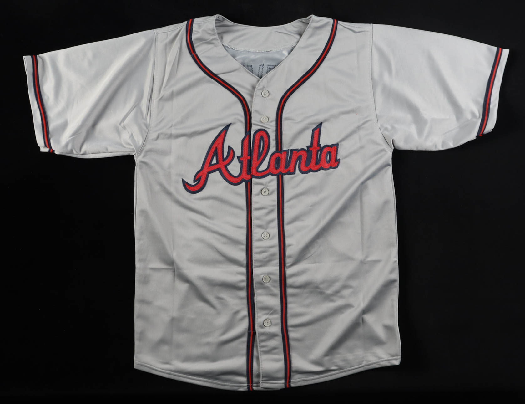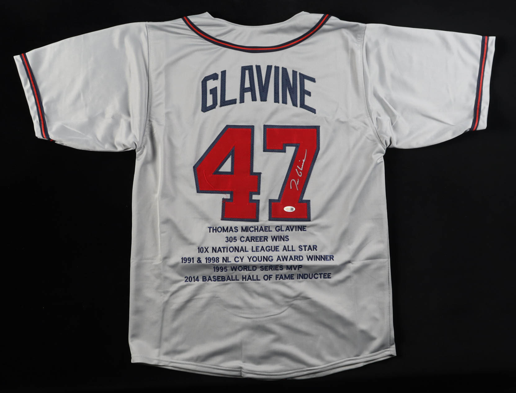Custom jersey with everything sewn on, size XL. Hand-signed by Tom Glavine (HOF). Glavine's career highlights have been custom stitched onto the back of the jersey below the reverse numbers.