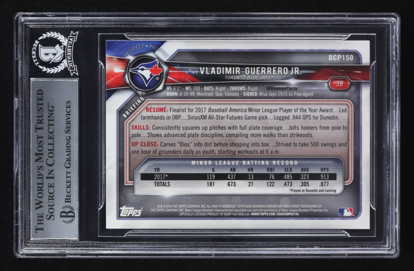 Vladimir Guerrero Jr. Signed 2018 Bowman Chrome Prospects #BCP-150 RC (BGS)