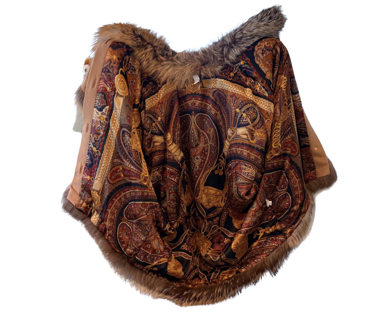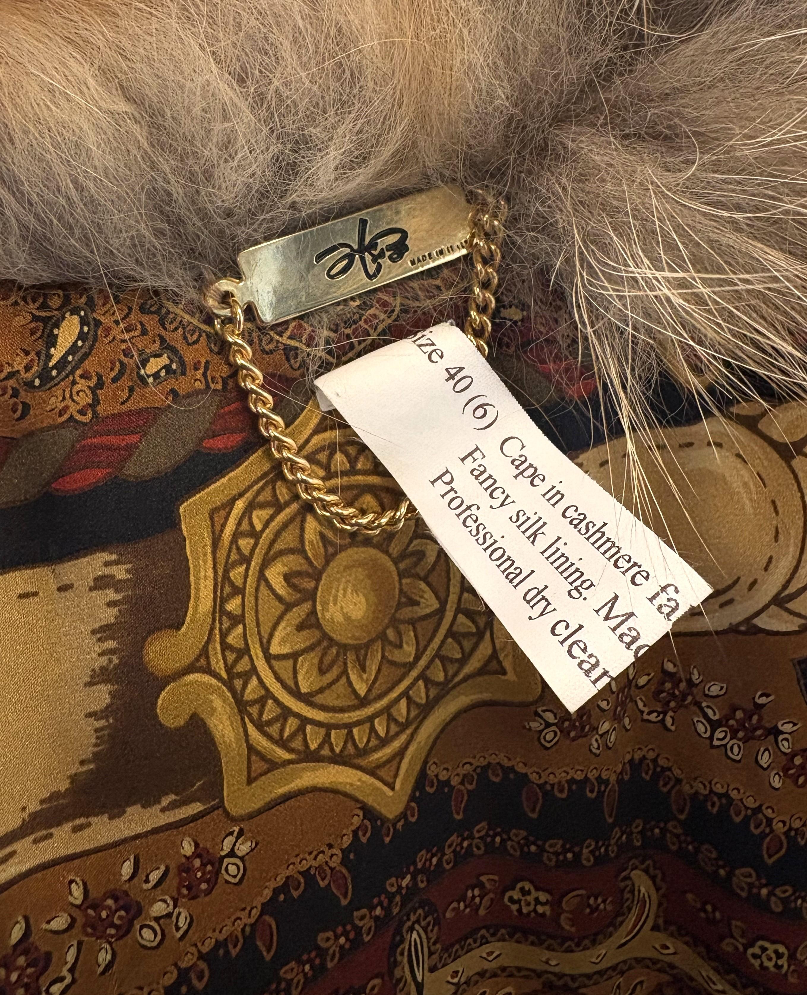 This tan cashmere cape features fox fur trim that wraps across the chest and around the neck, as well as lining the sleeves and hem. The interior is composed of a burgundy and gold paisley patterned silk. Sleek lines are maintained by the covered button closure on the front. Tasteful, refined, and oh-so-soft. Size 40 (6). From the Collection of Betty Jane France, founder of The NASCAR Foundation.