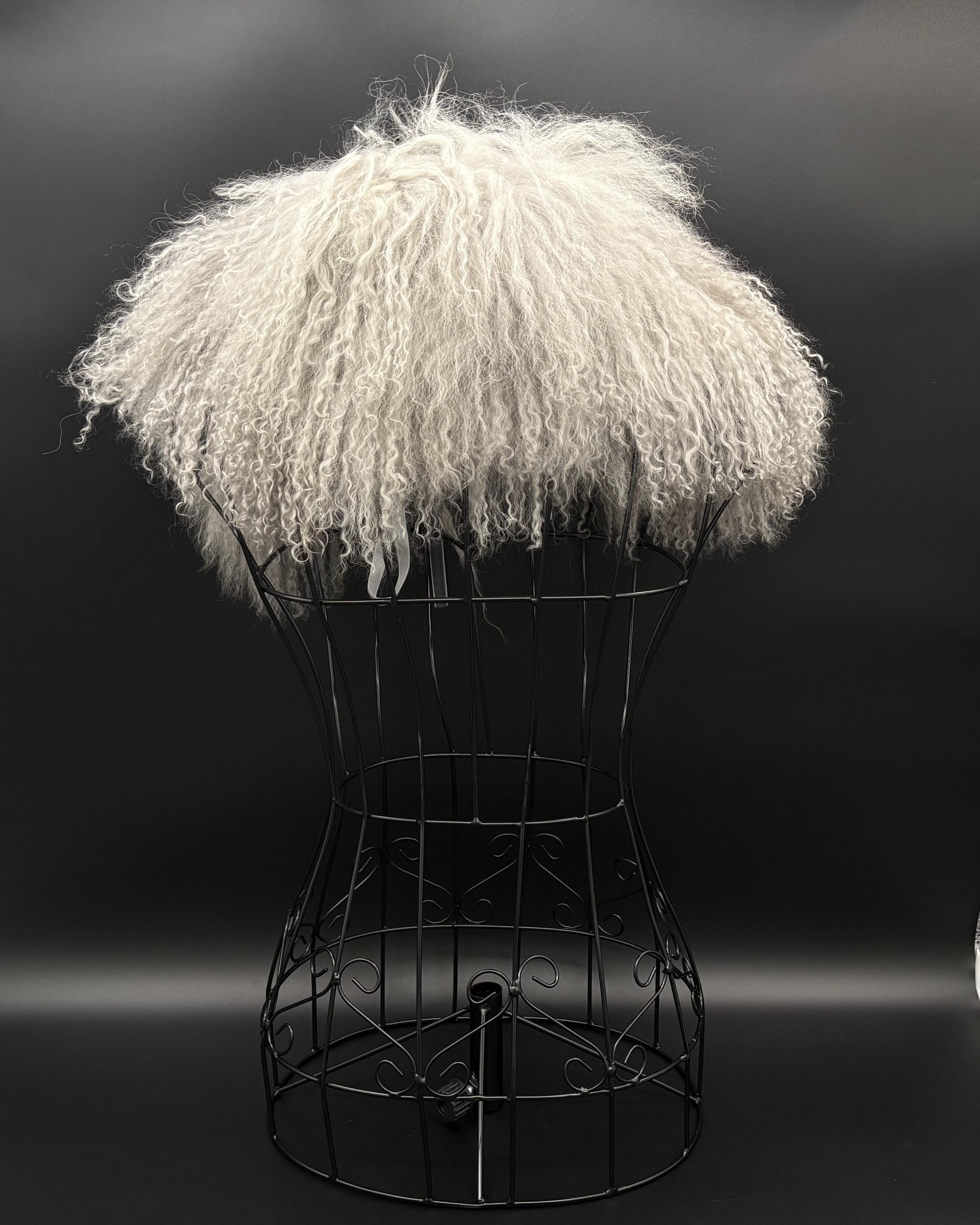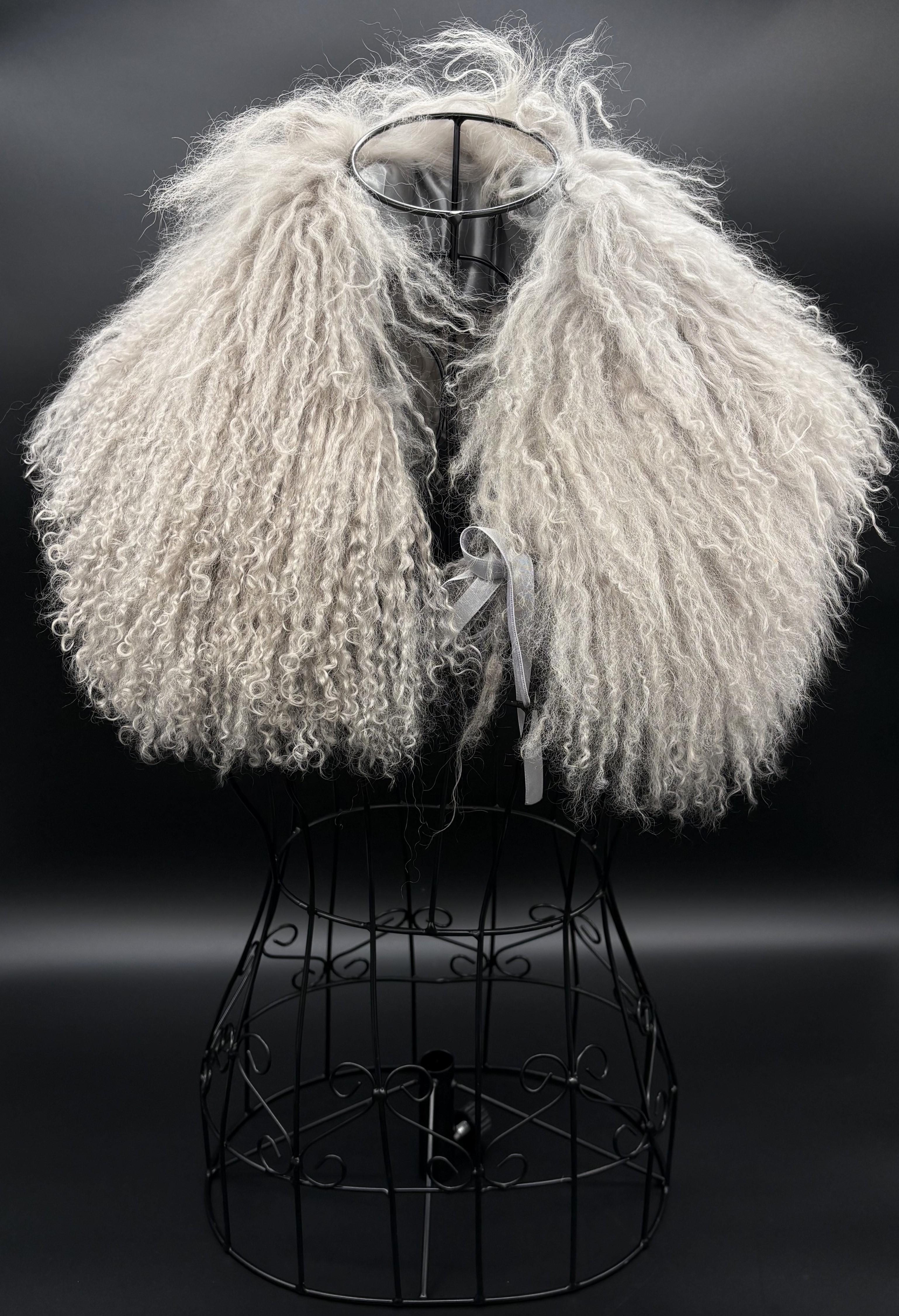 Known for its luxurious, curly texture, Mongolian lamb wool is light, yet warm. Layer this soft, gray collar over your evening wear to keep cool night air at bay. A satin-lined interior and ribbon tie closure lend to its luxurious feel. No brand tag; this piece may have been custom made for Betty Jane France, founder of The NASCAR Foundation.