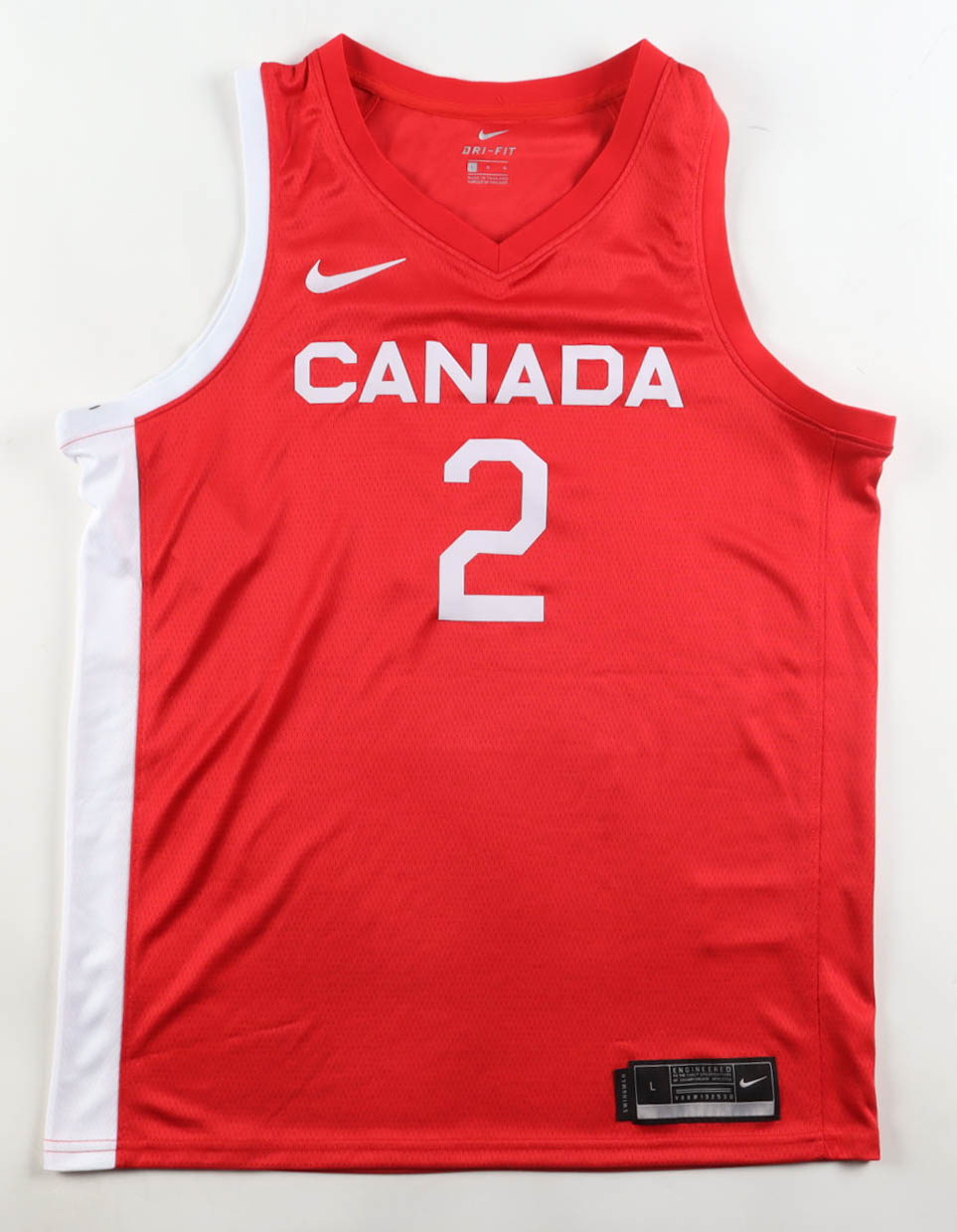 Nike authentic jersey with everything pressed on, size L. Hand-signed by Shai Gilgeous-Alexander (Team Canada).