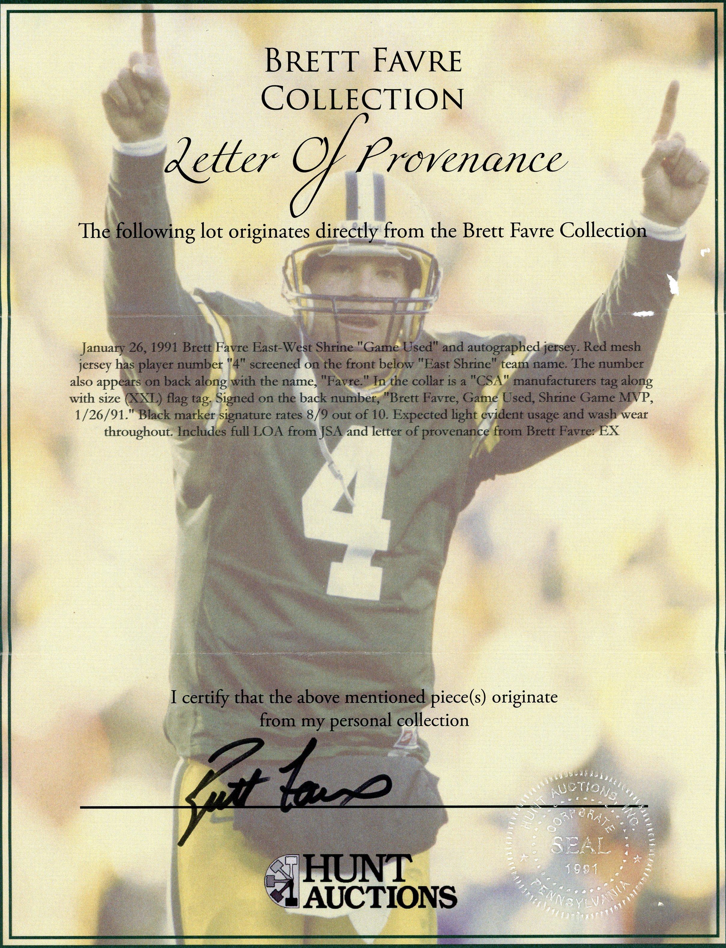 Brett Favre Signed 1991 Game-Used Shrine Bowl Jersey Inscribed "Game Used" & "Shrine Game MVP 1/26/91" (JSA)