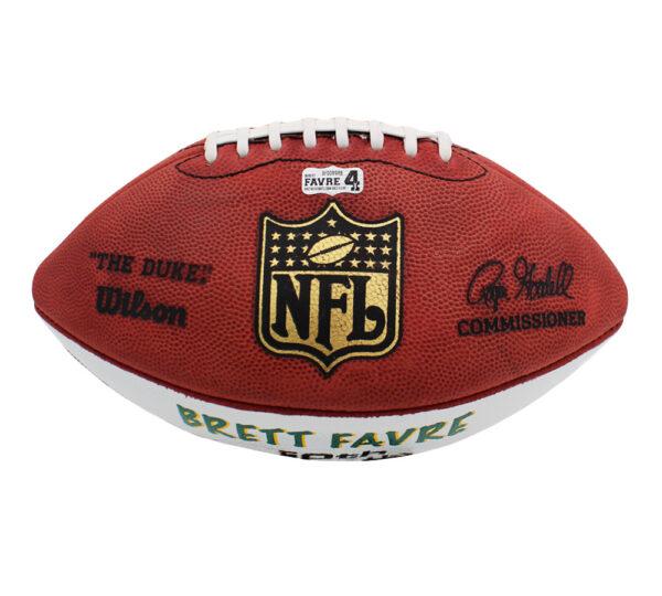 Wilson NFL "The Duke" Green Bay Packers commemorative football has been hand-signed by Brett Favre (HOF).
