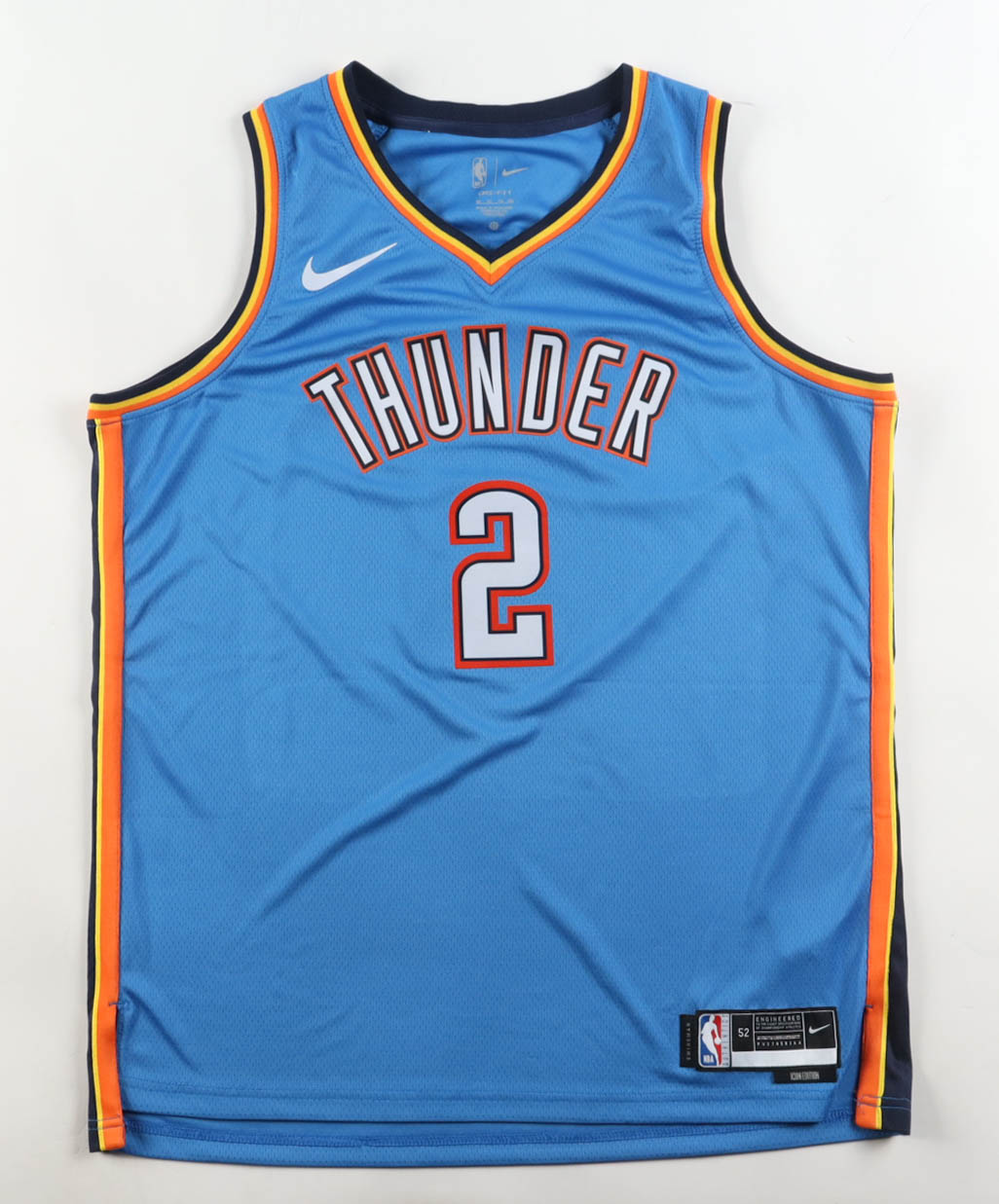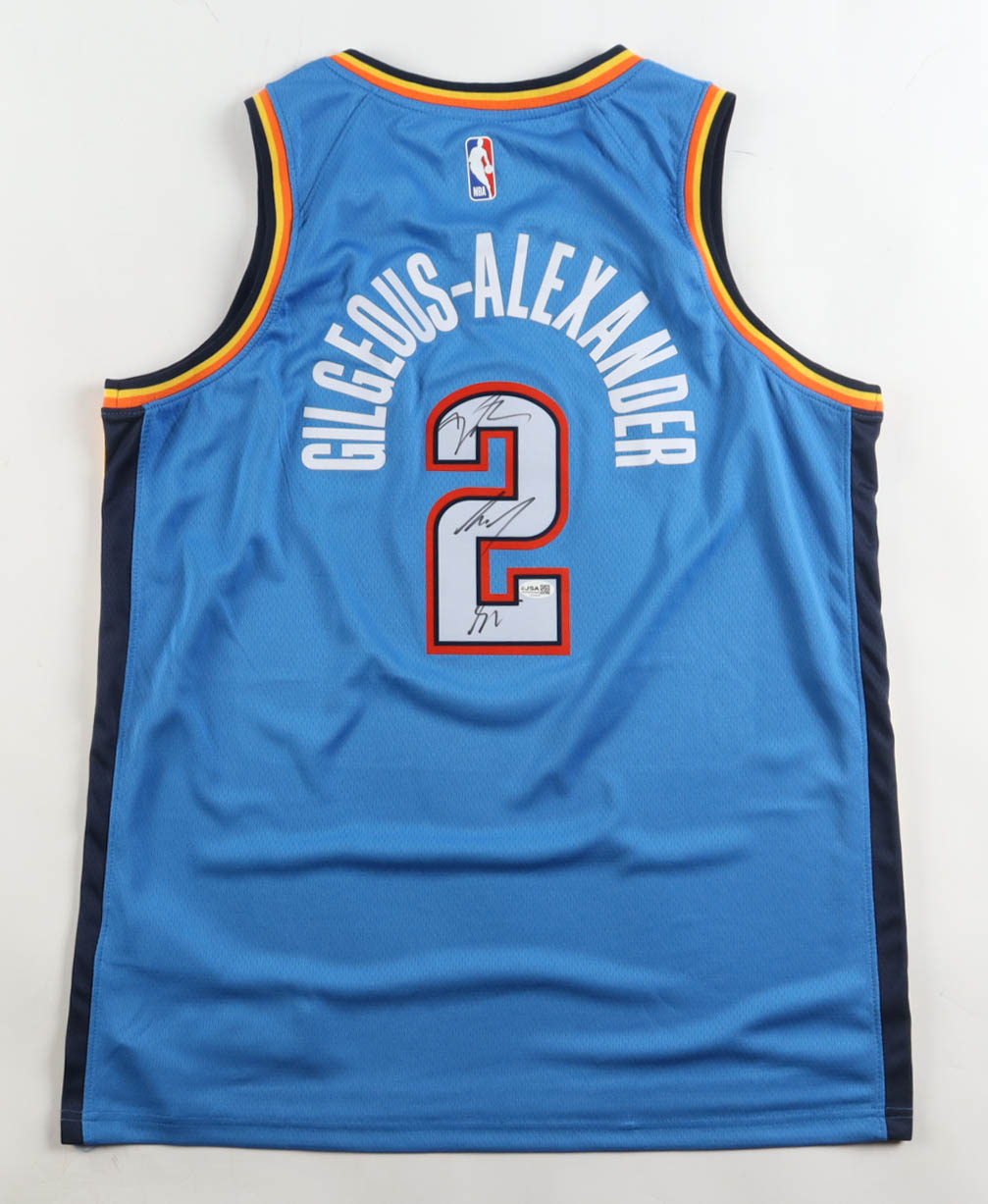 Nike authentic jersey with everything pressed on, size 52. Hand-signed by Shai Gilgeous-Alexander, Jalen Williams, & Luguentz Dort (Oklahoma City Thunder).