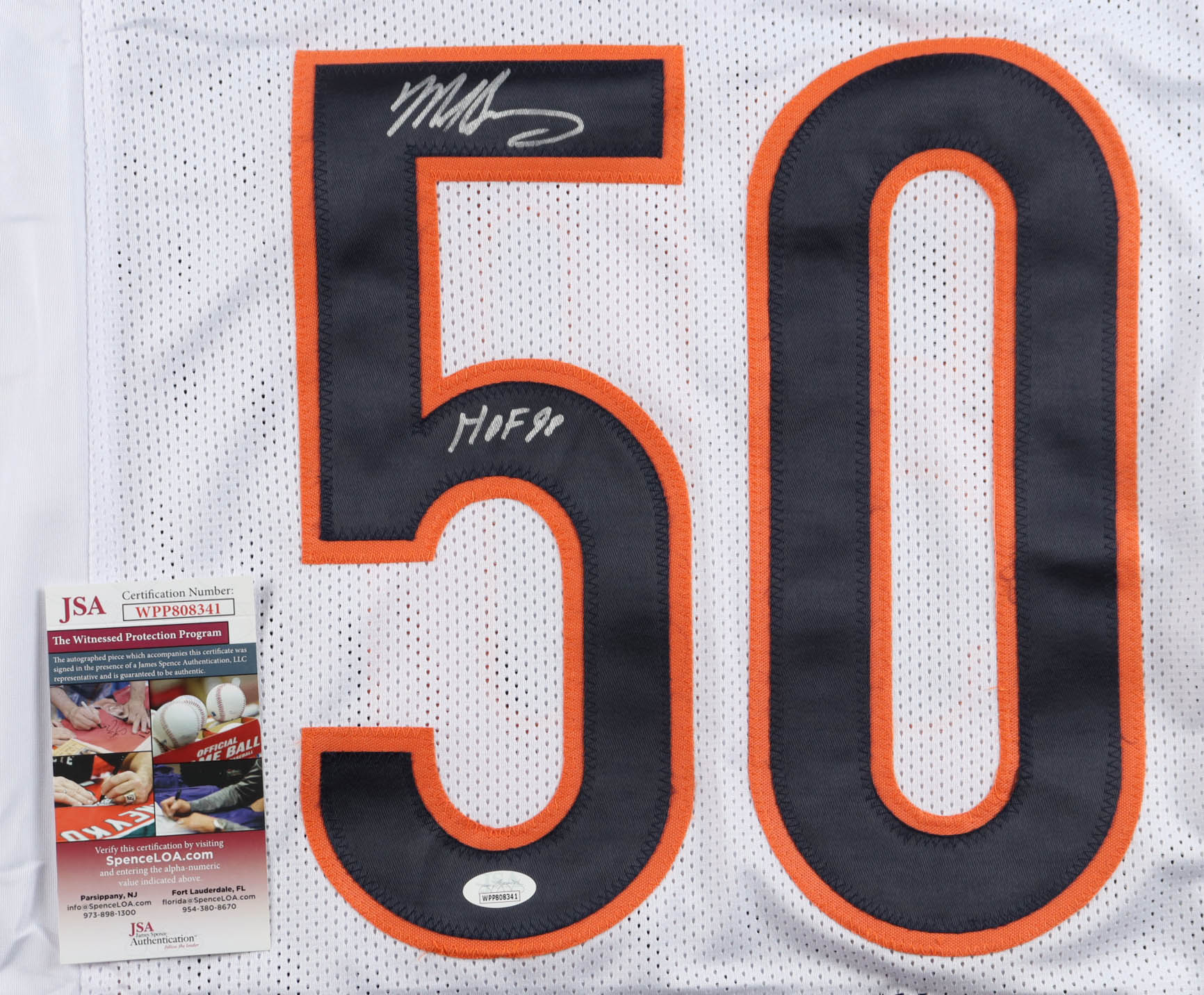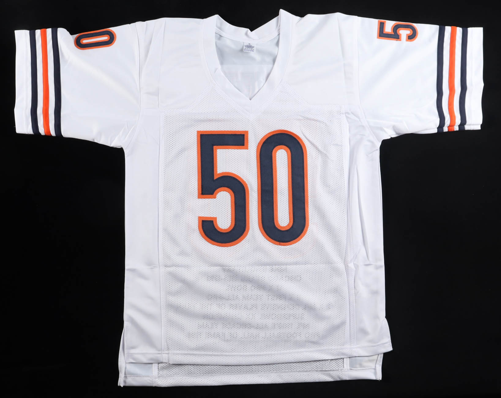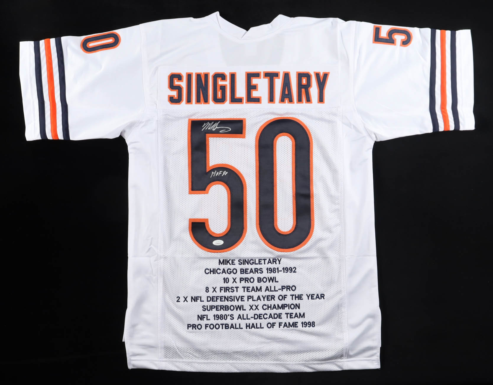 Custom jersey with everything sewn on, size XL. Hand-signed and inscribed by Mike Singletary (HOF). Singletary's career stats have been custom stitched in the jersey below the reverse numbers