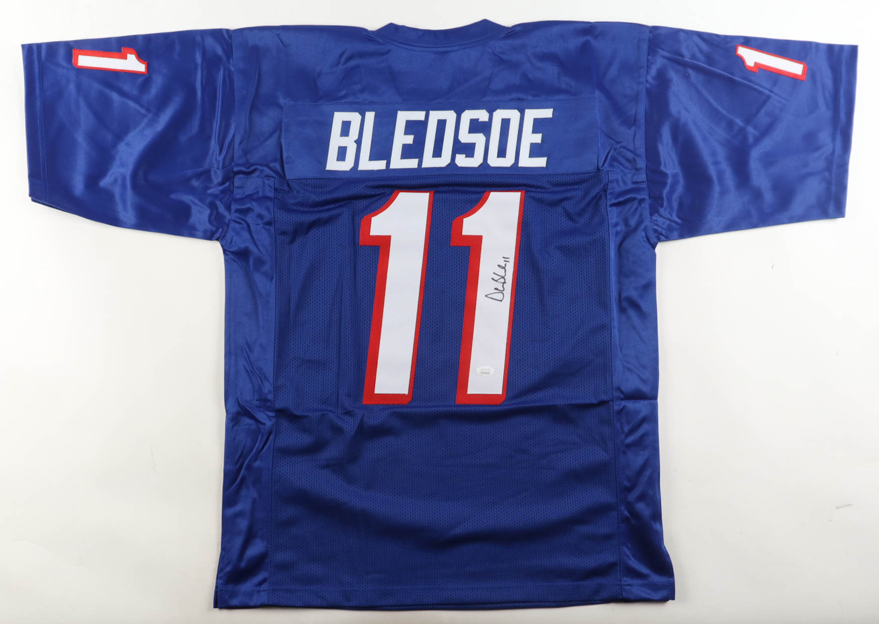 Custom jersey with everything sewn on, size XL. Hand-signed by Drew Bledsoe.