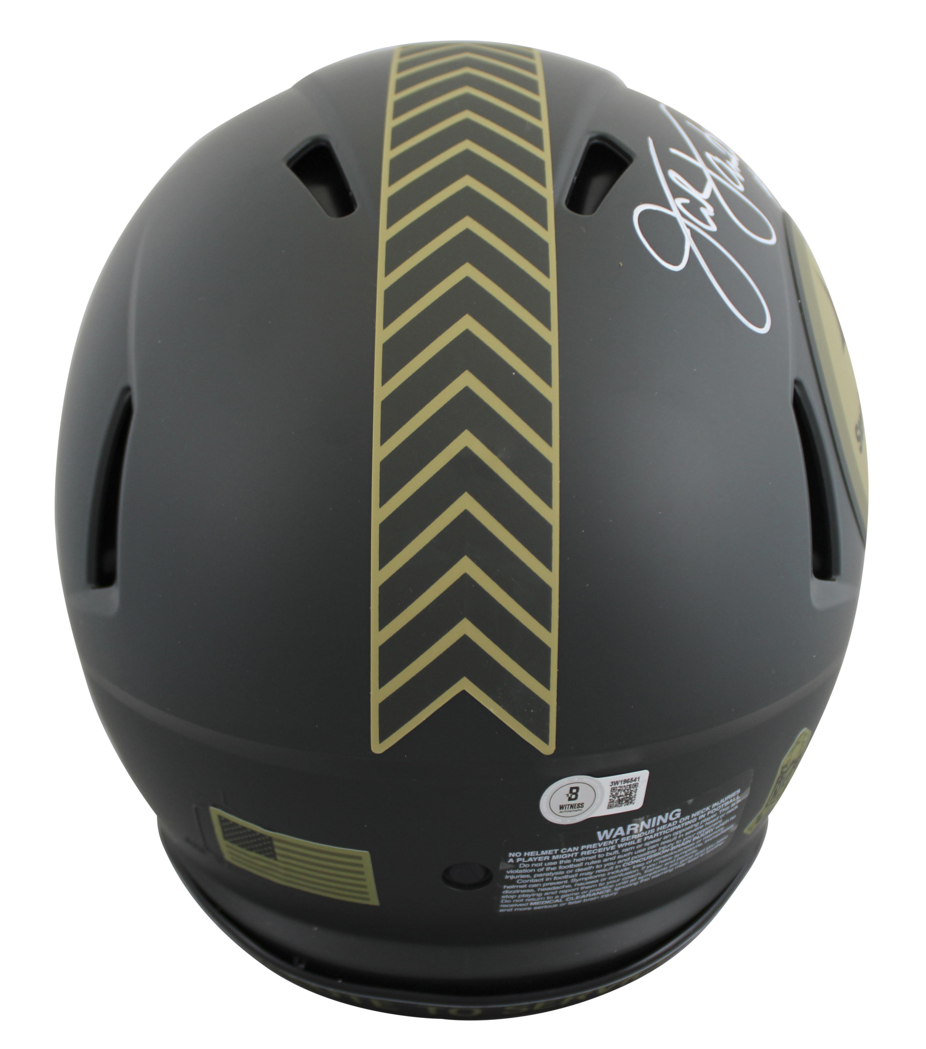Riddell Pittsburgh Steelers full-size authentic on-field salute to service alternate speed helmet has been hand-signed and inscribed by Jack Lambert (HOF).