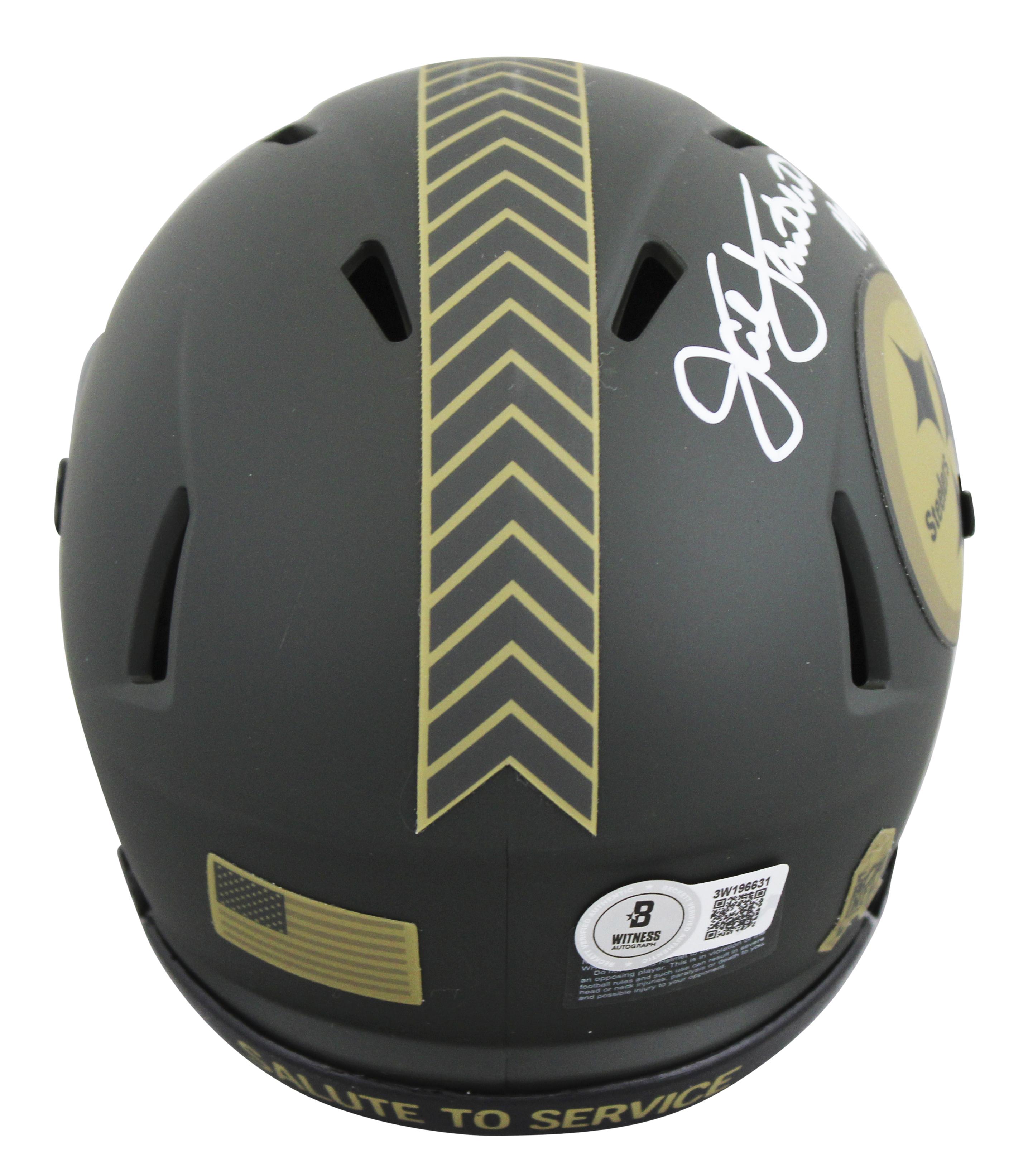 Riddell Pittsburgh Steelers salute to service alternate speed mini helmet has been hand-signed and inscribed by Jack Lambert (HOF).