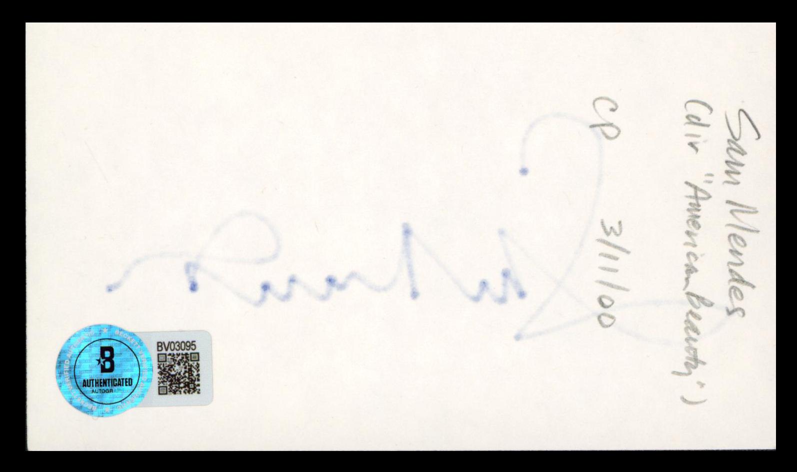 Index card measures approximately 3" x 5" in size and has been hand-signed by Sam Mendes.