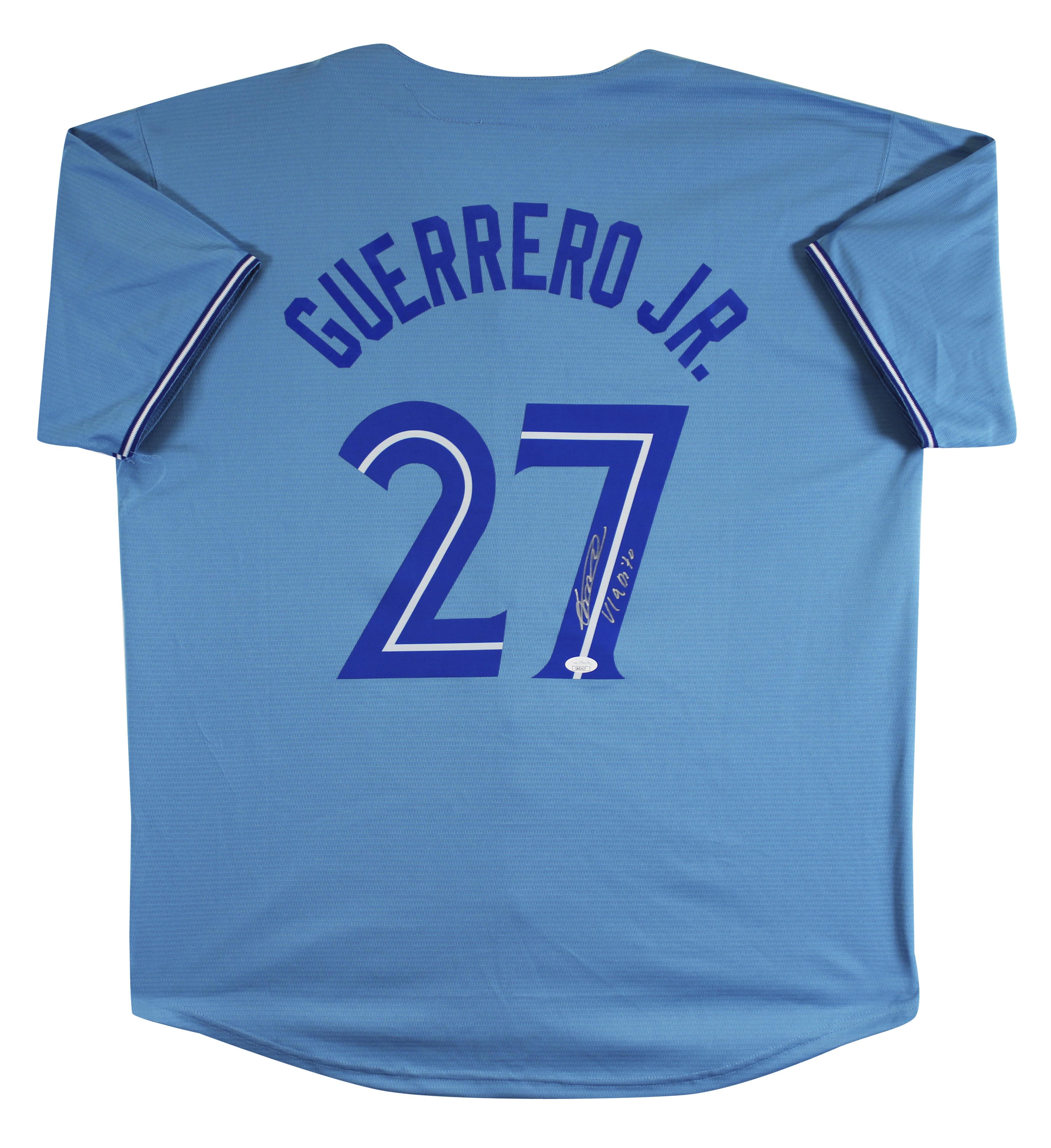 Custom jersey with everything sewn on, size XL. Hand-signed and inscribed by Vladimir Guerrero Jr. (Toronto Blue Jays).