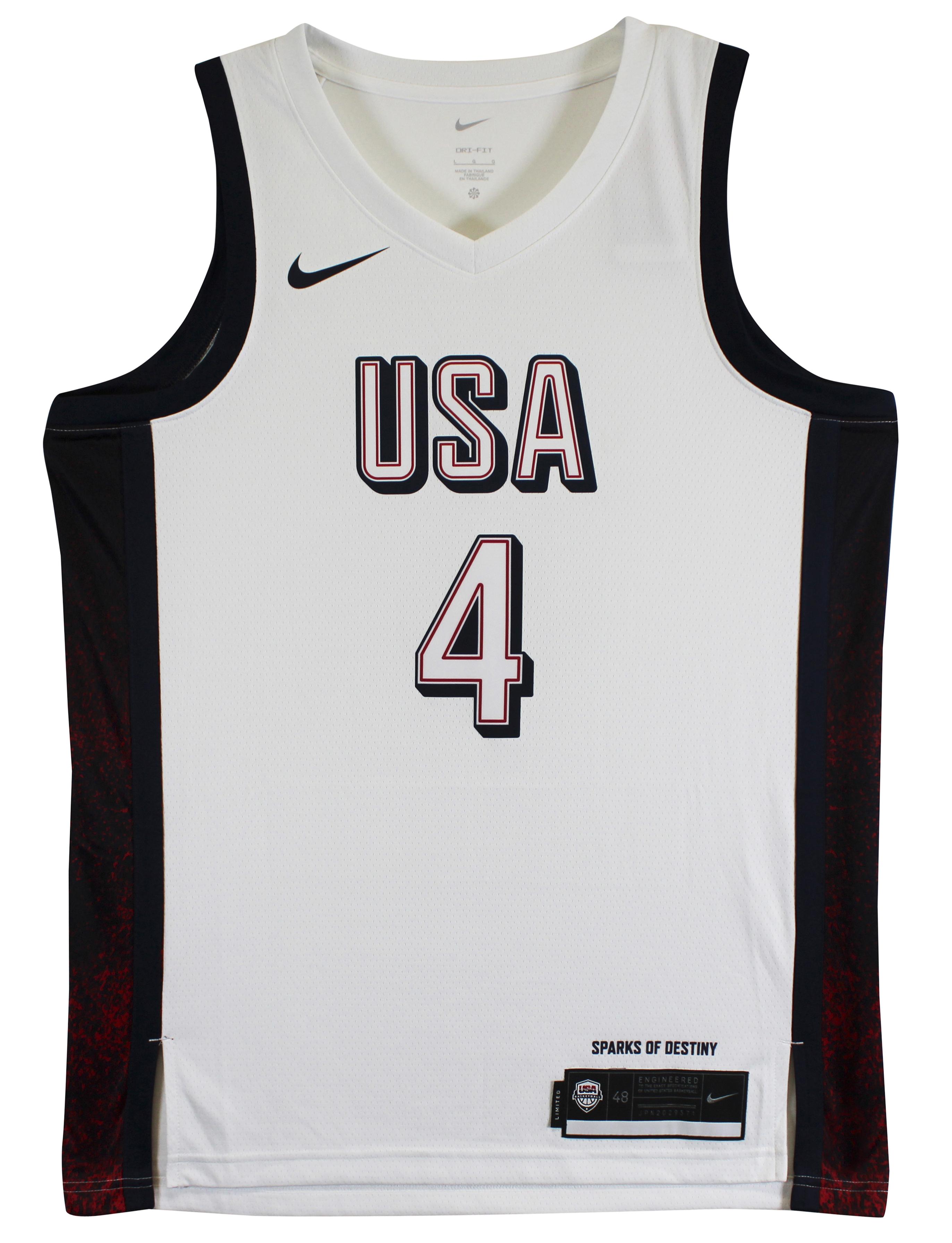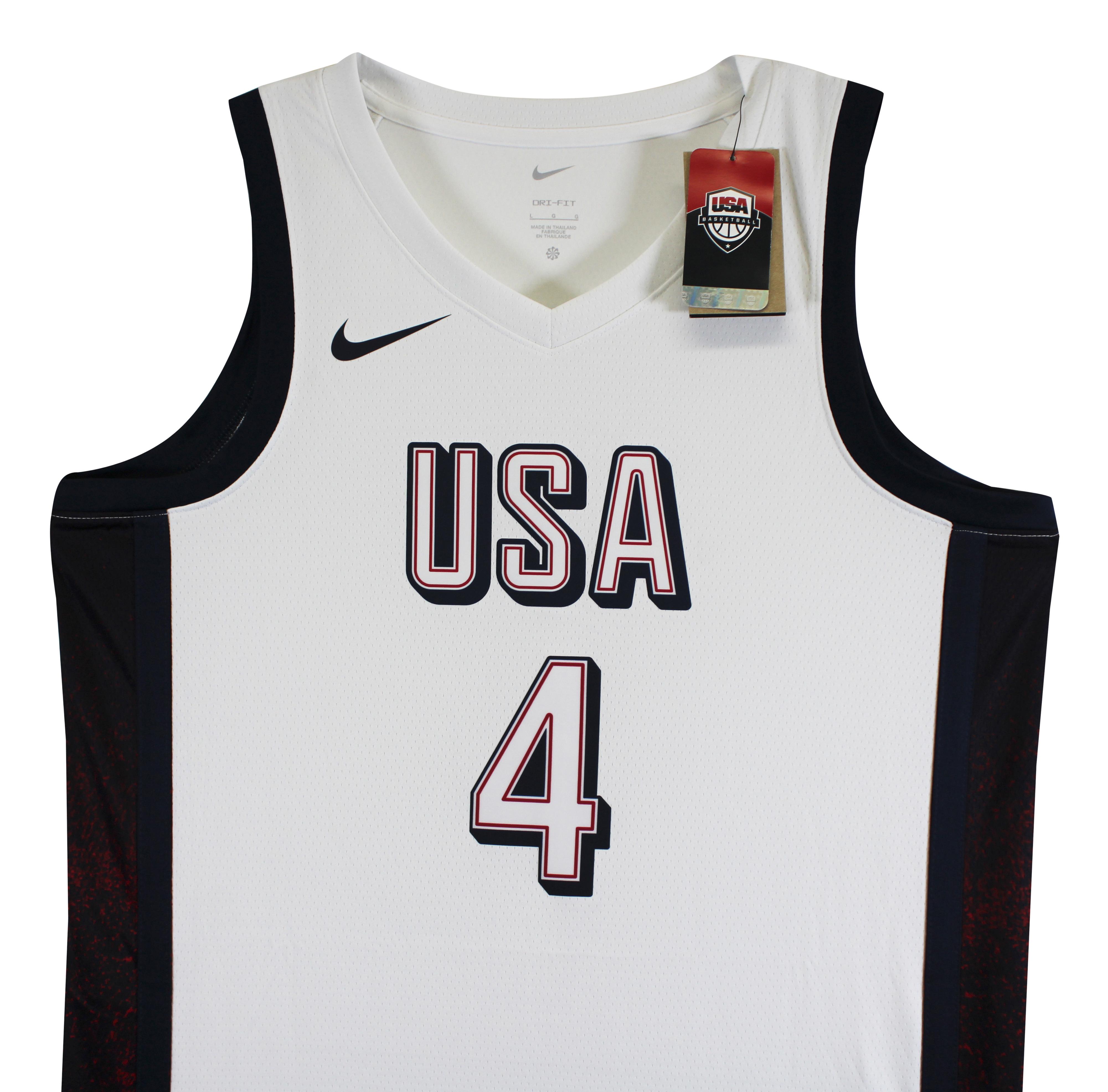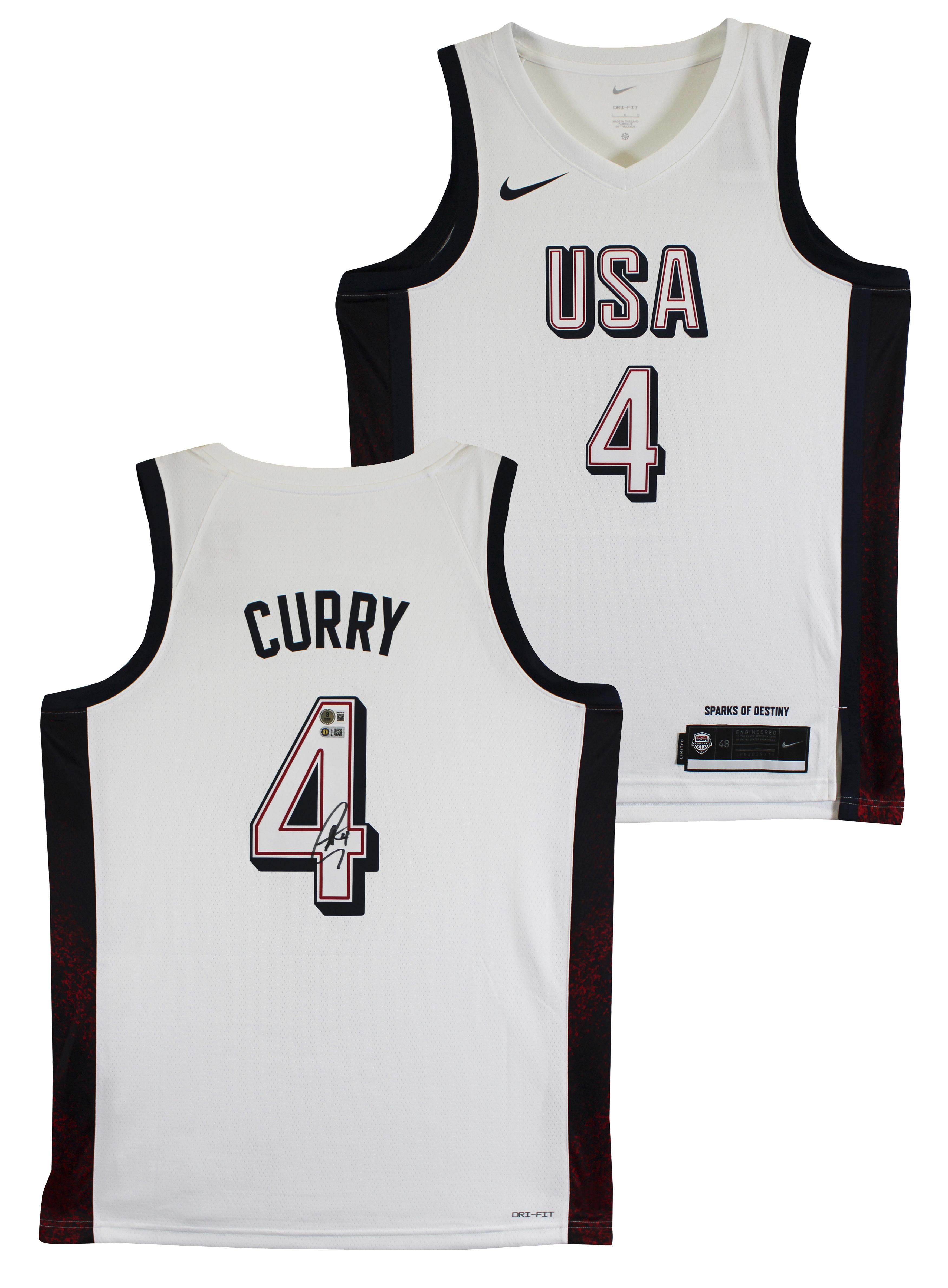 Nike authentic jersey with everything sewn on, size 48. Hand-signed by Stephen Curry (Team USA).