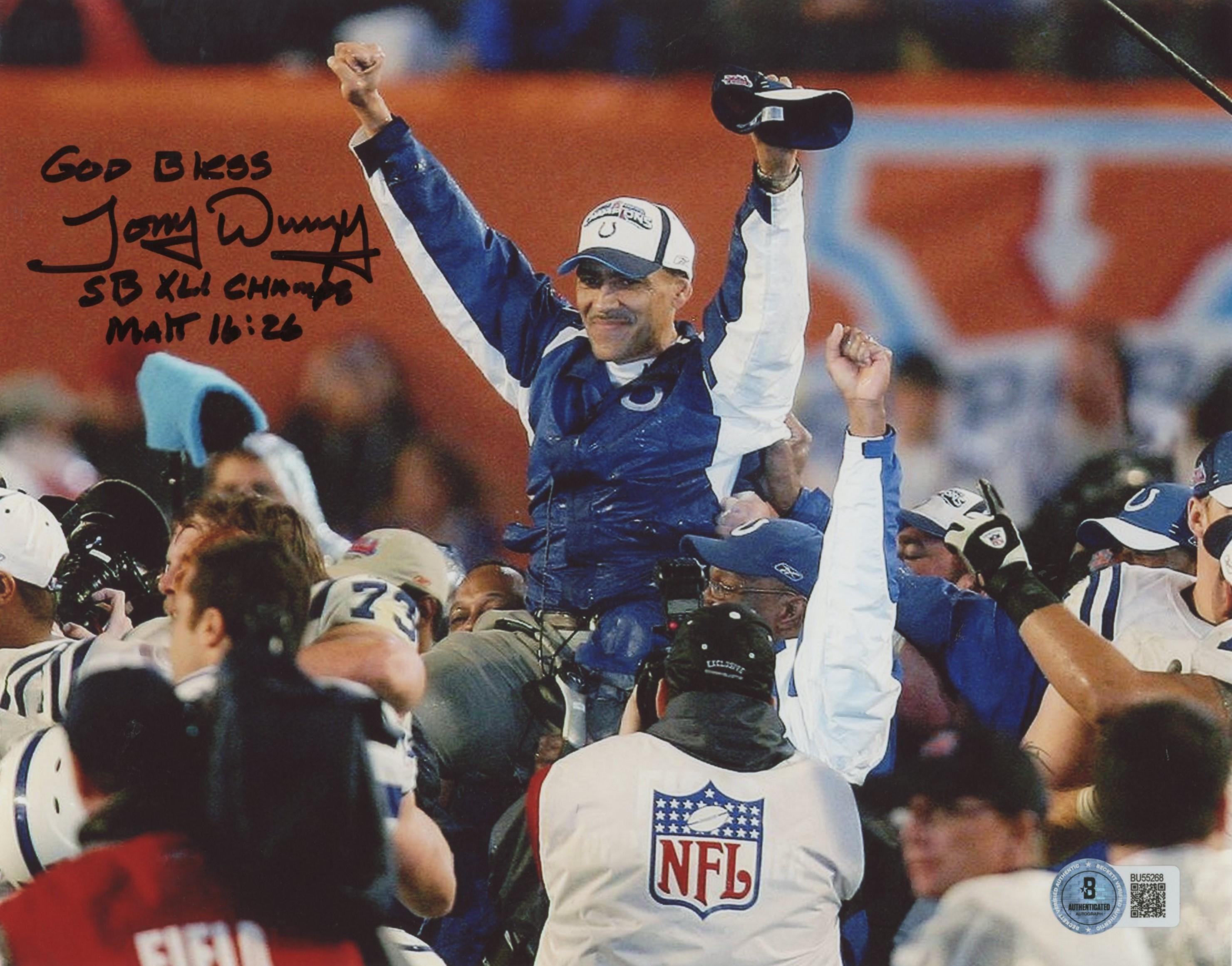 Photo measures approximately 8" x 10" in size and has been hand-signed and inscribed by Tony Dungy.