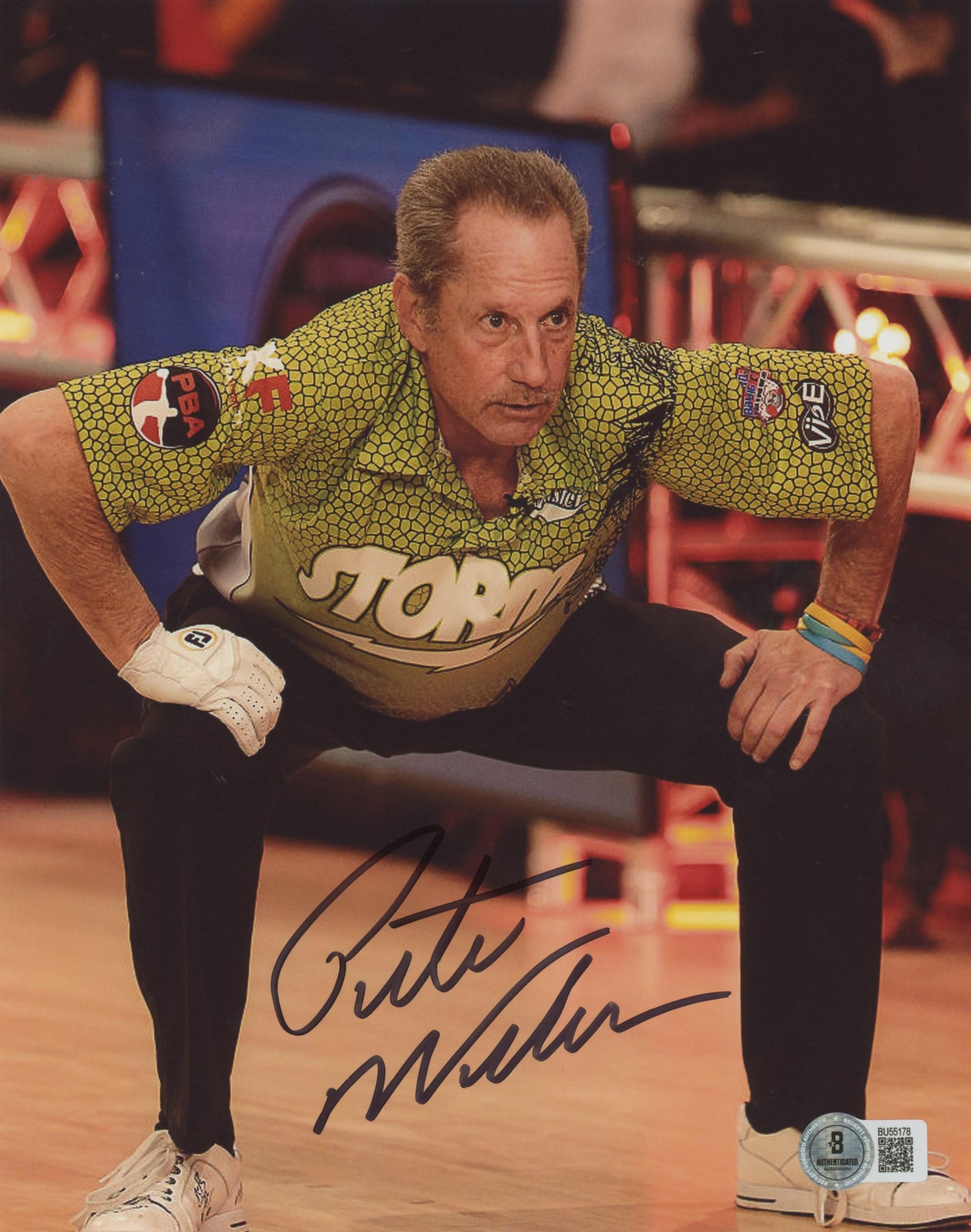 Photo measures approximately 8" x 10" in size and has been hand-signed by Pete Weber (HOF).