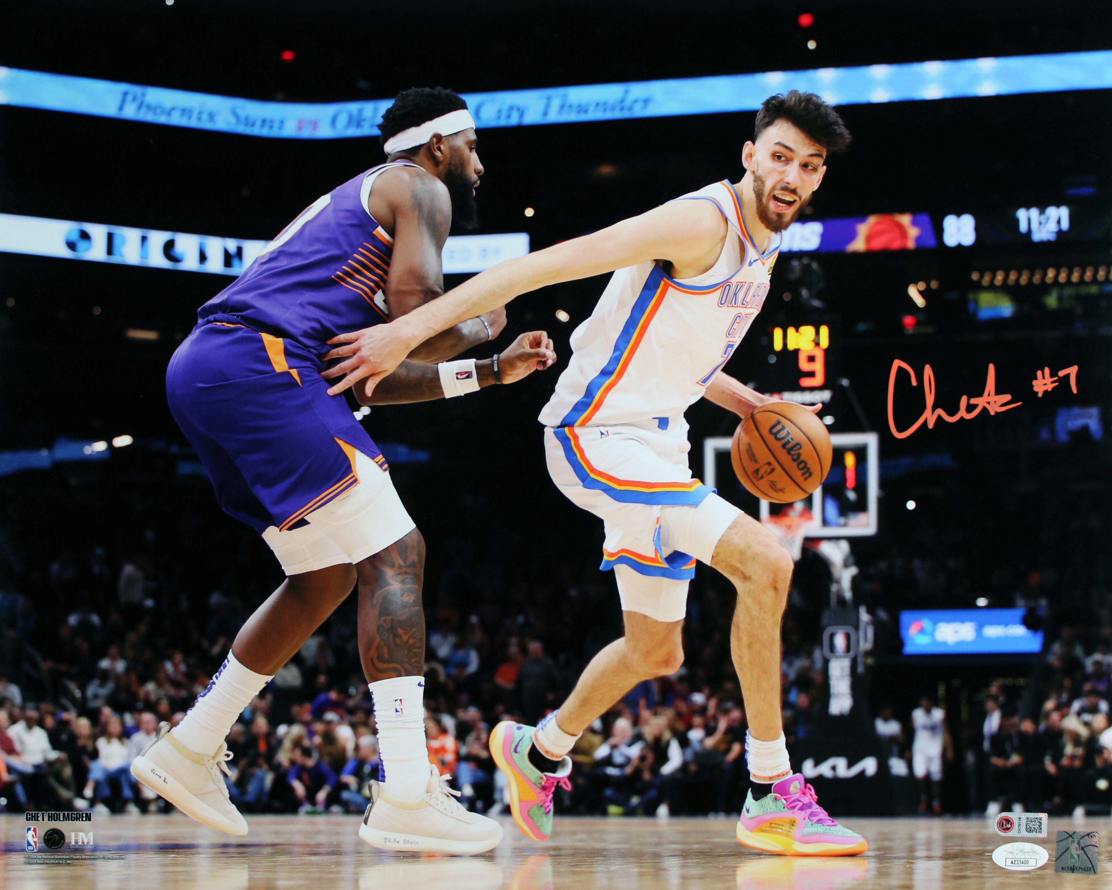 Photo measures approximately 16" x 20" in size and has been hand-signed by Chet Holmgren (Oklahoma City Thunder).