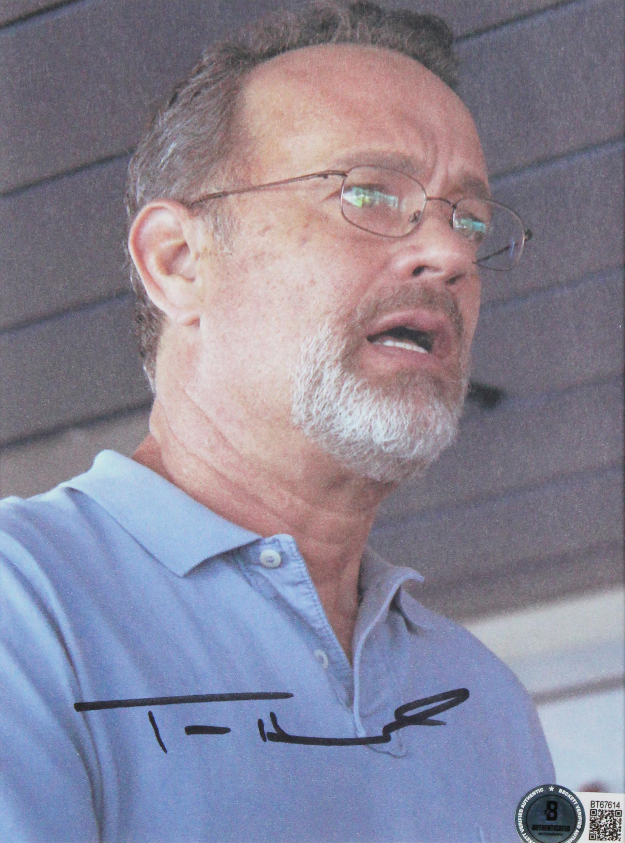 Custom framed display measures approximately 17.5" x 30.5" in size and features a photo that has been hand-signed by Tom Hanks.