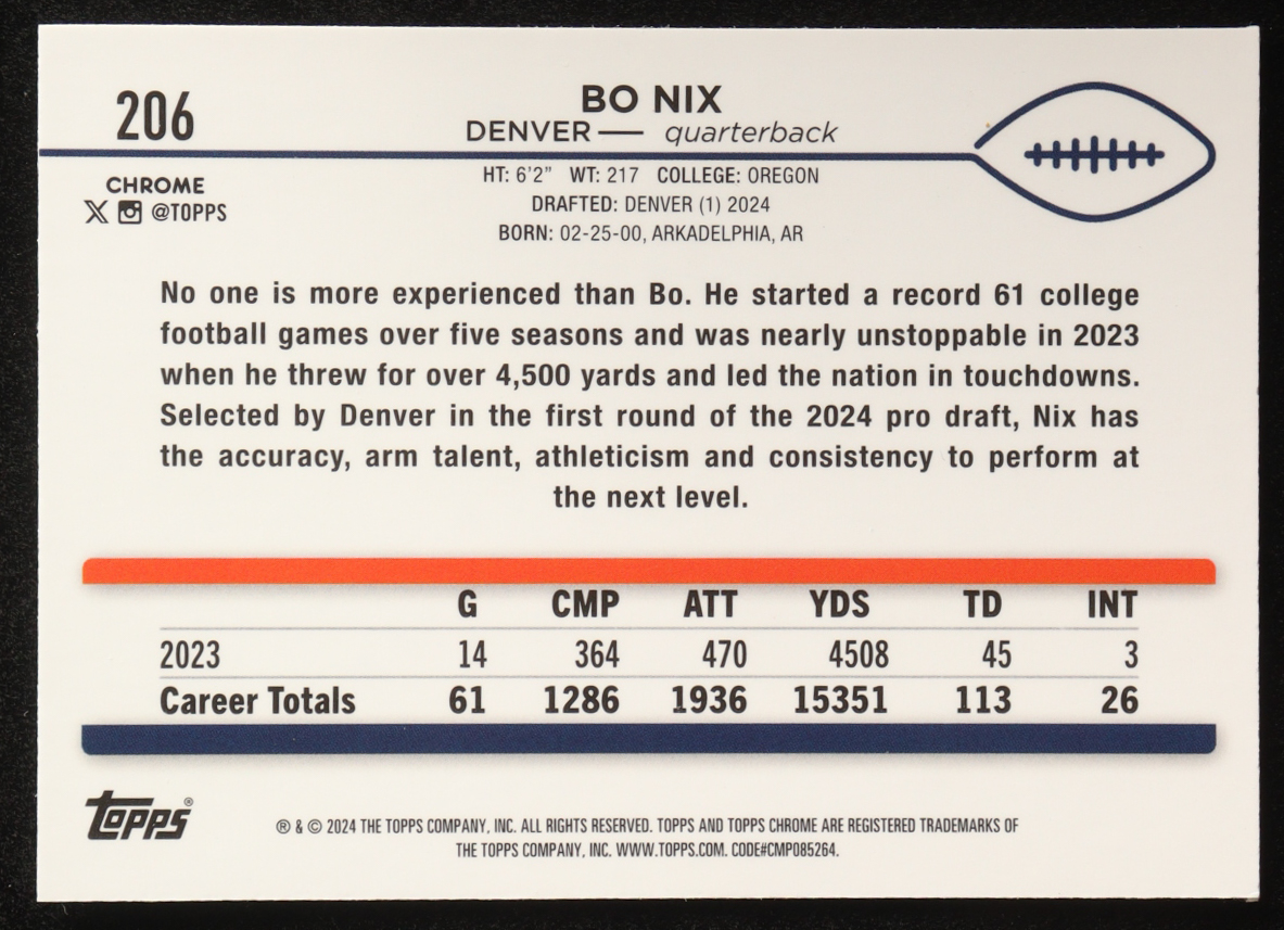 Bo Nix 2024 Topps Chrome #206 Bo Nix RC