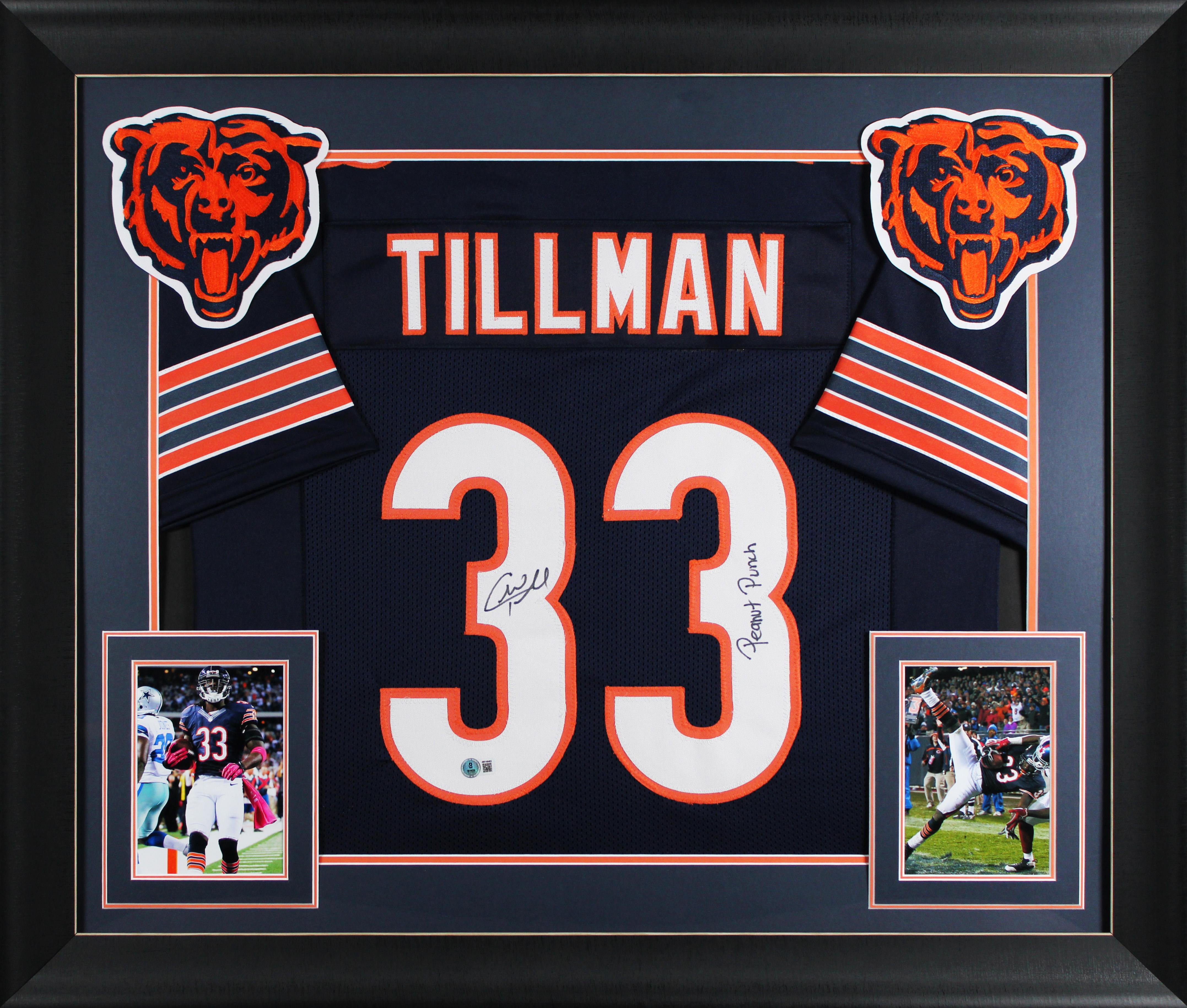 Custom framed display measures approximately 32" x 37” in size and features a jersey that has been hand-signed and inscribed by Charles Tillman (Chicago Bears).