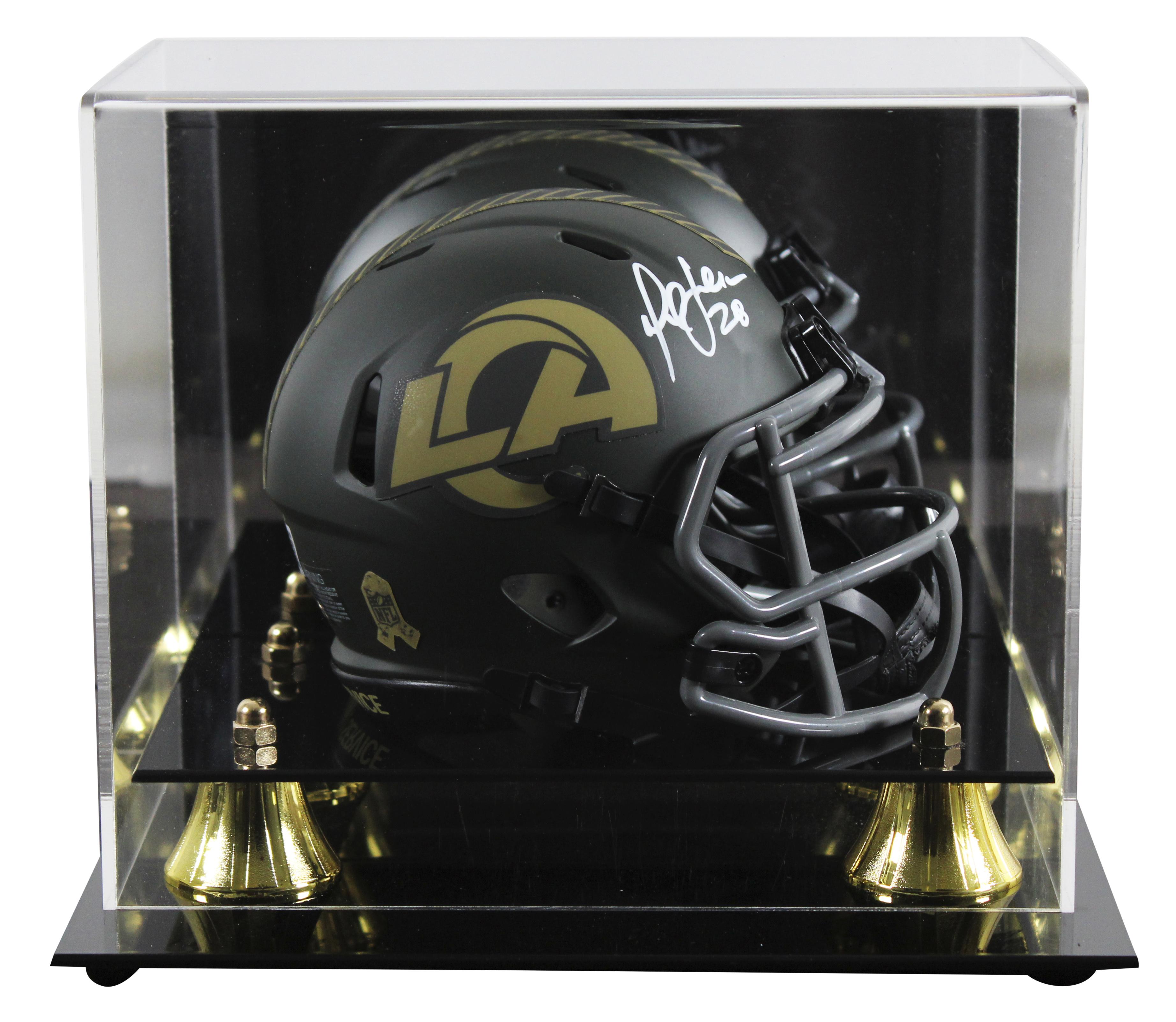 Riddell Los Angeles Rams salute to service alternate speed mini helmet has been hand-signed by Marshall Faulk (HOF). Display case is included as shown.