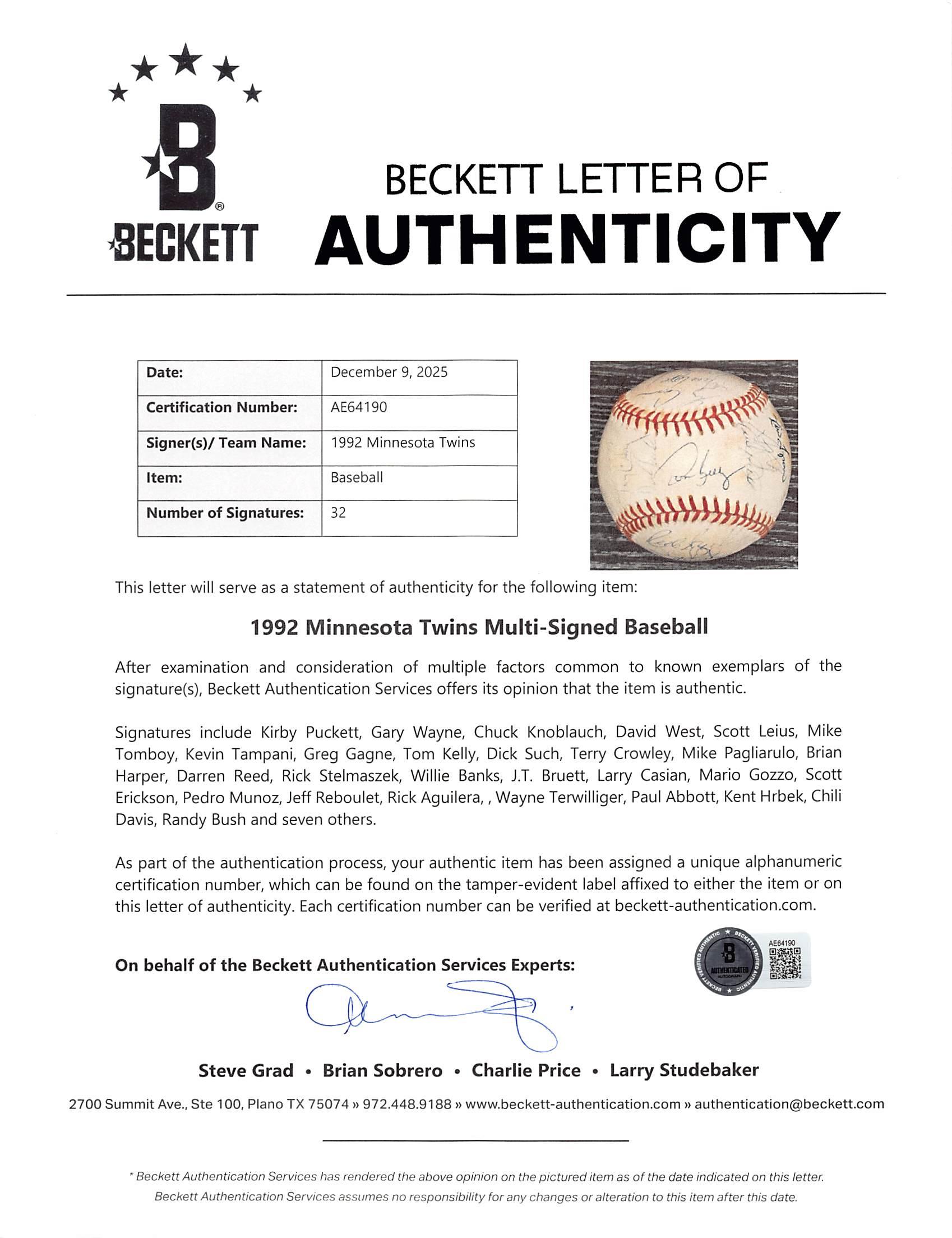 Rawlings Official American League baseball has been hand-signed by (32) members of the 1992 Minnesota Twins! Signers include Kirby Puckett, Gary Wayne, Chuck Knoblauch, David West, Scott Leius, Mike Tomboy, Kevin Tampani, Greg Gagne, Tom Kelly, Dick Such, Terry Crowley, Mike Pagliarulo, Brian Harper, Darren Reed, Rick Stelmaszek, Willie Banks, J.T. Bruett, Larry Casian, Mario Gozzo, Scott Erickson, Pedro Munoz, Jeff Reboulet, Rick Aguilera, Wayne Terwilliger, Paul Abbott, Kent Hrbek, Chili Davis, Randy Bush, and (7) others.