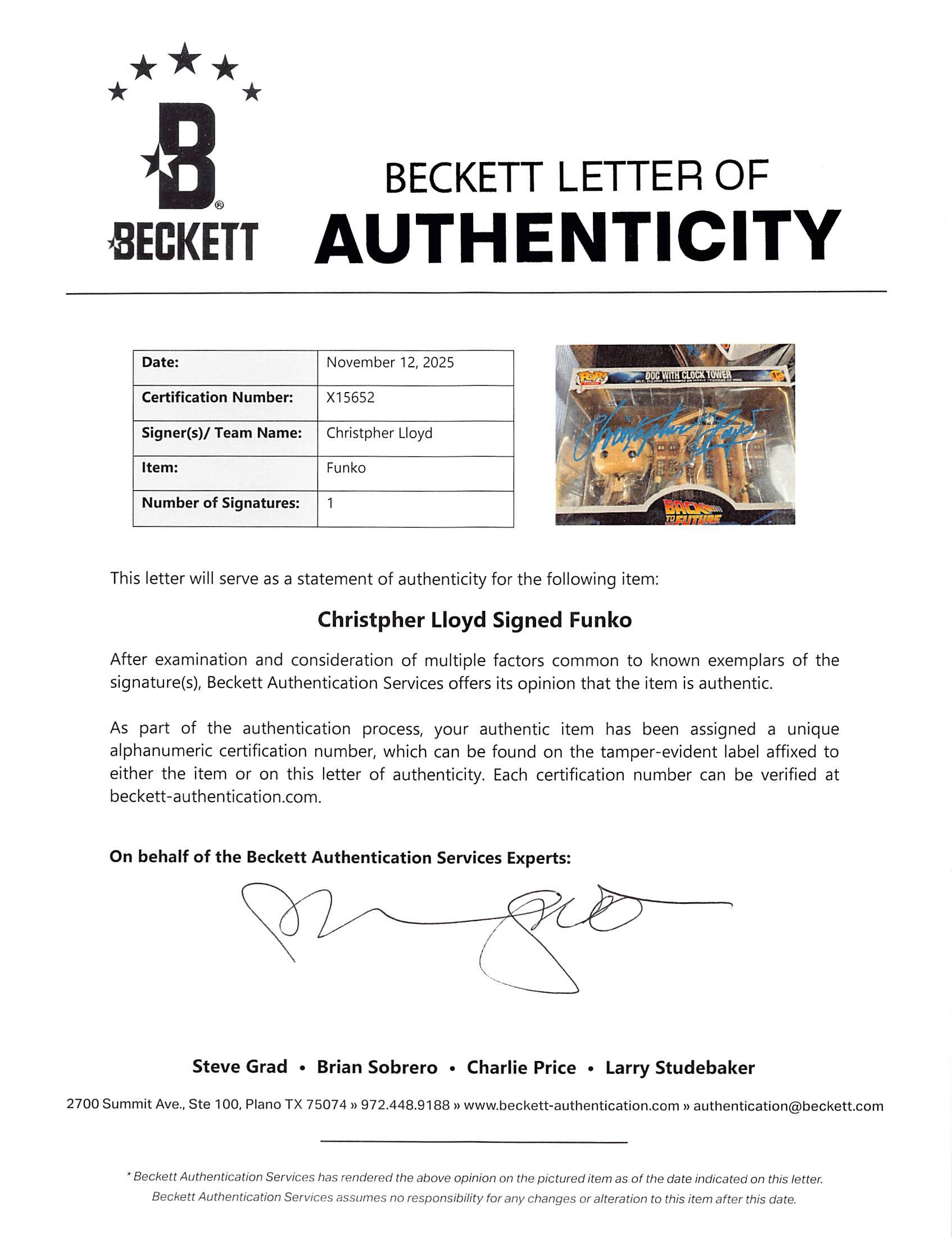 Funko Pop! vinyl figure measures approximately 4" in height and has been hand-signed on the packaging by Christopher Lloyd.