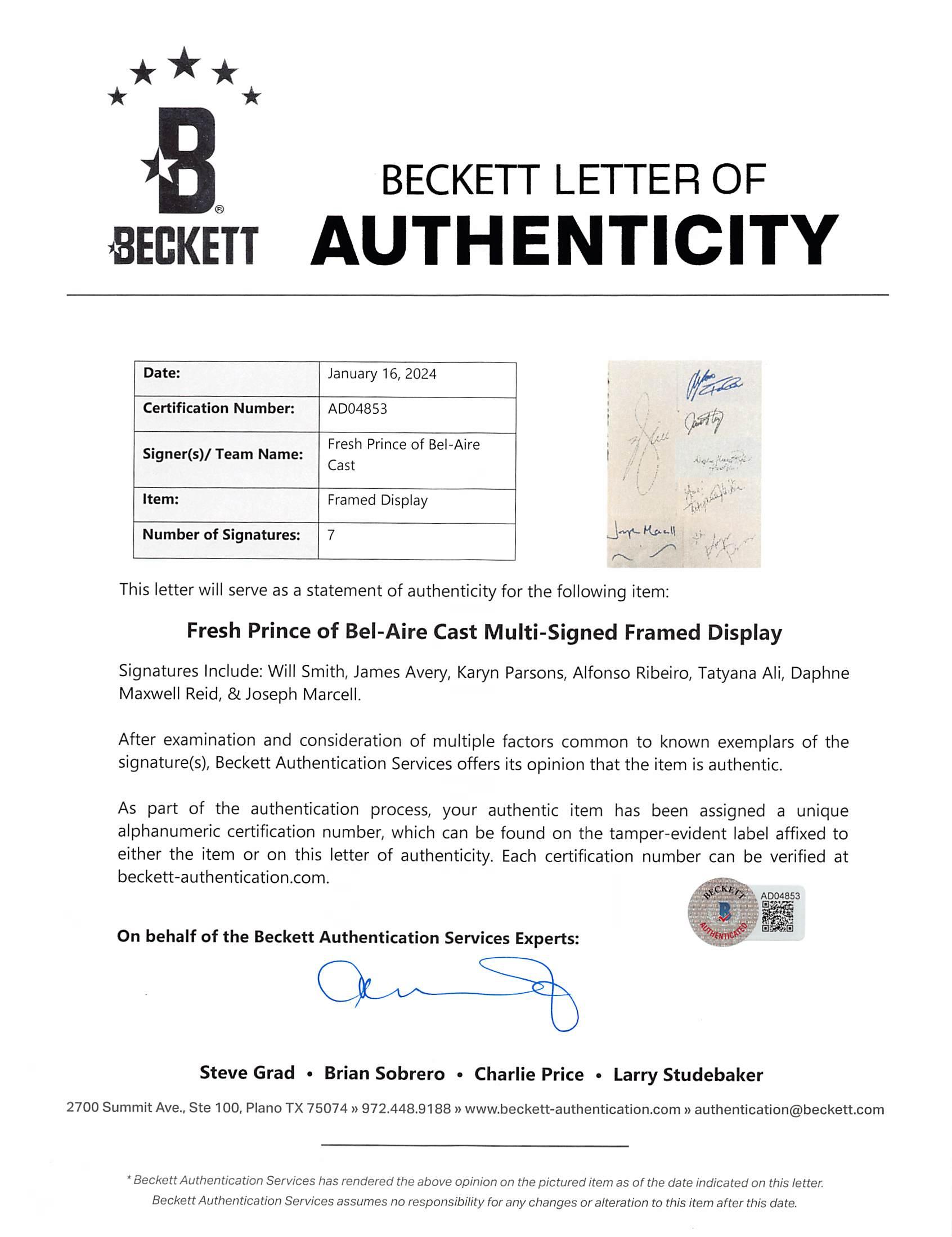 "Fresh Prince of Bel-Air" Custom Framed Cut Display Cast-Signed By (7) with Will Smith, James Avery, Alfonso Ribeiro (Beckett)