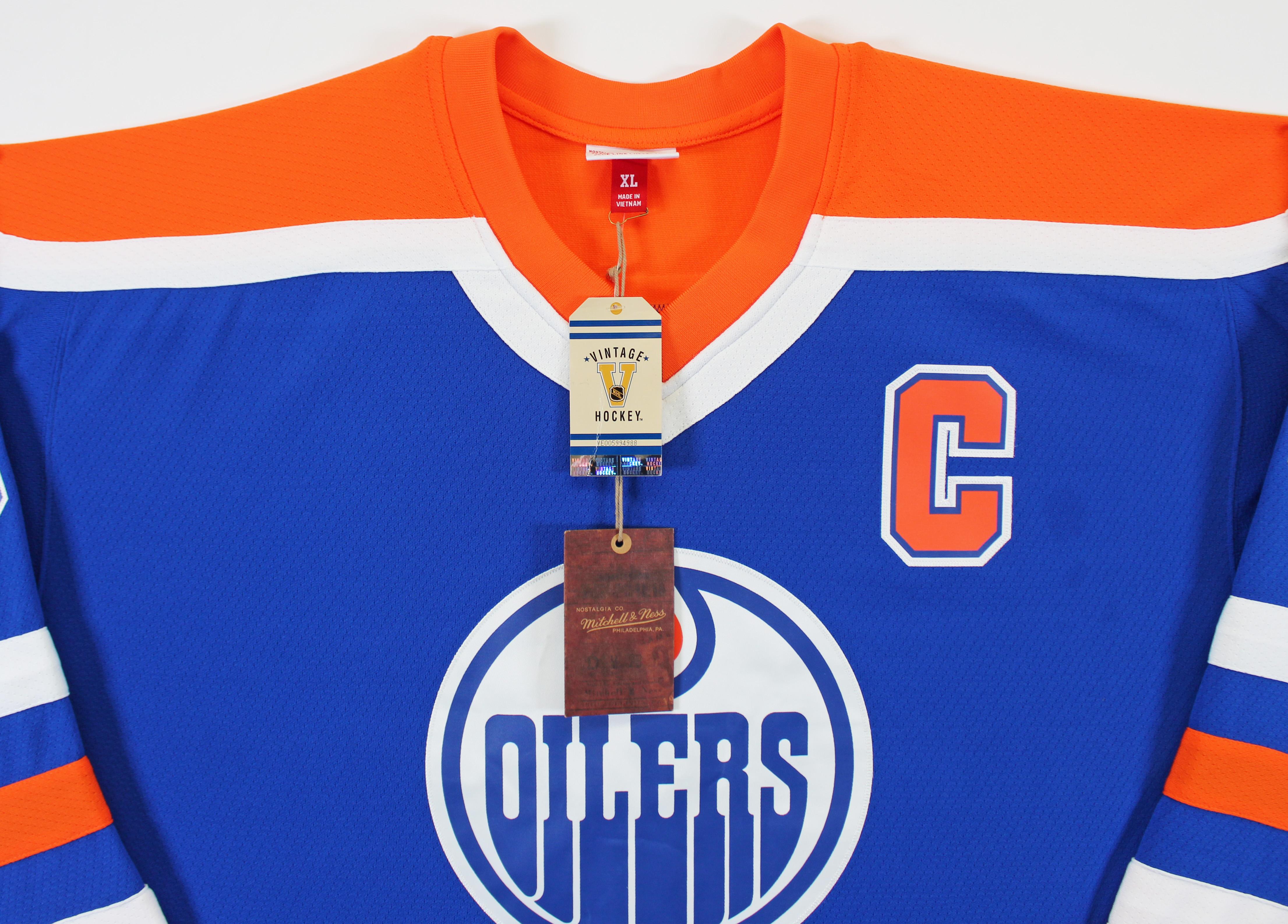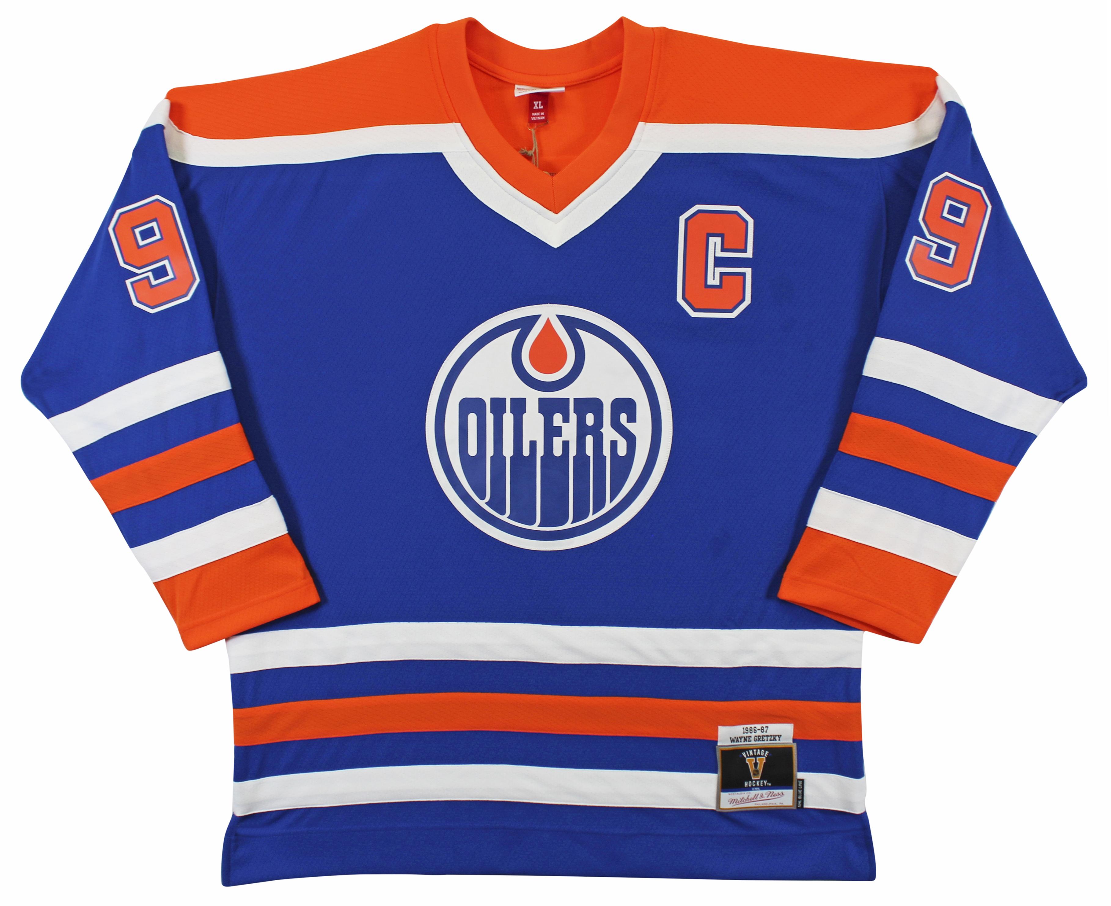 1986-87 Mitchell & Ness jersey with everything sewn on, size XL. Hand-signed by Wayne Gretzky (Edmonton Oilers, HOF).