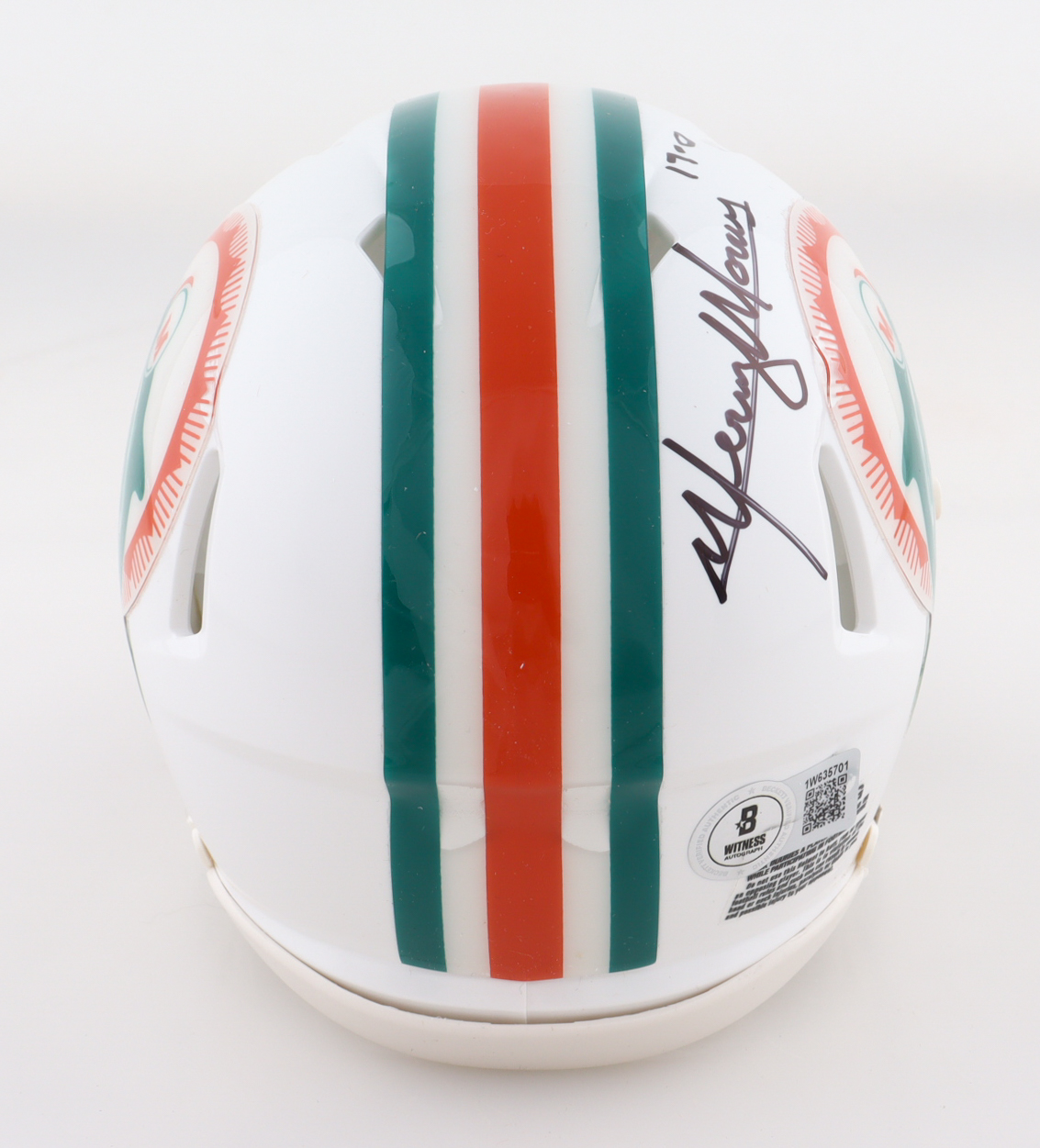 Riddell Miami Dolphins Speed mini helmet. Hand-signed and inscribed by Mercury Morris.