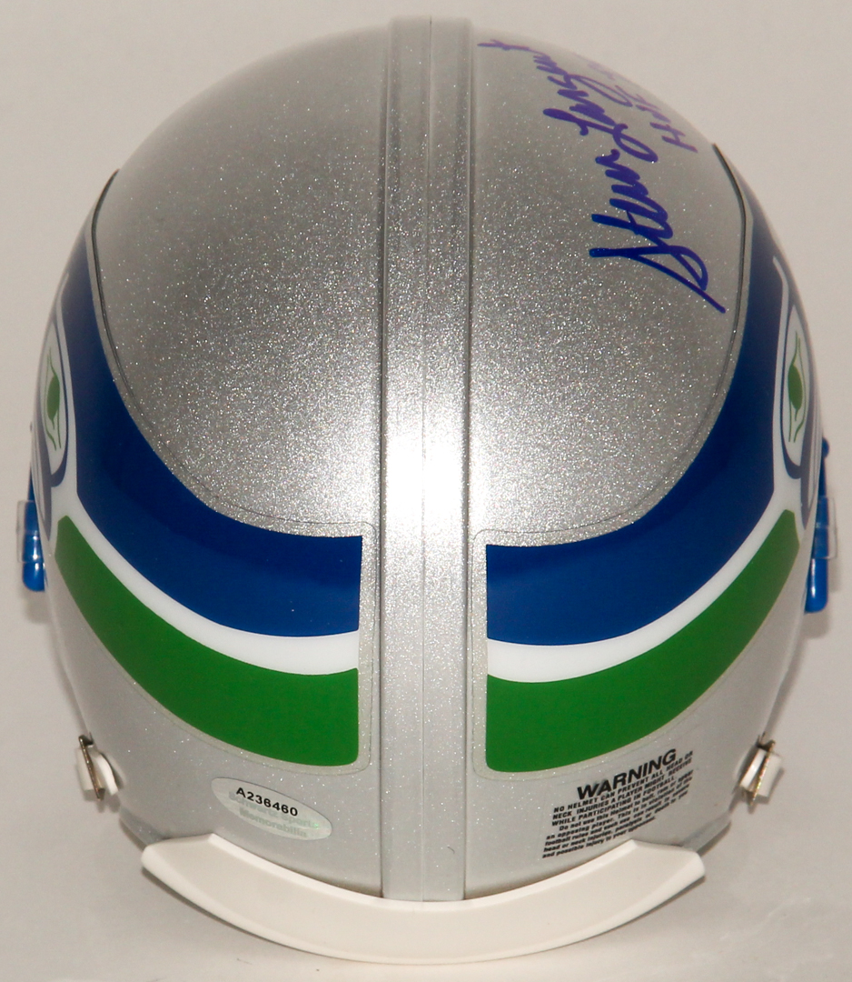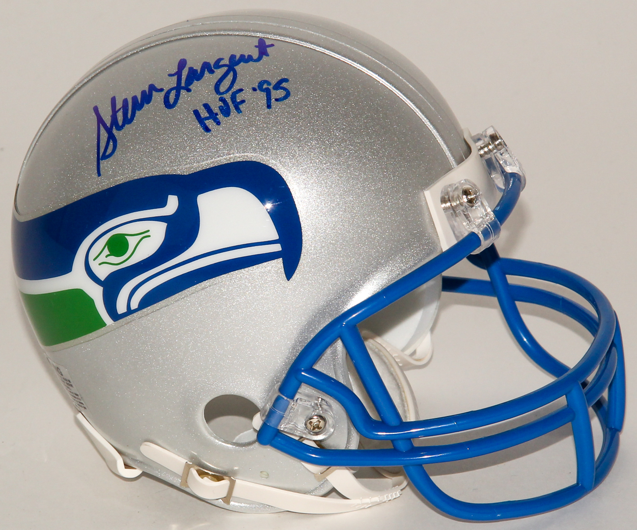 Seattle Seahawks mini helmet hand-signed and inscribed in blue felt-tip pen by Steve Largent.