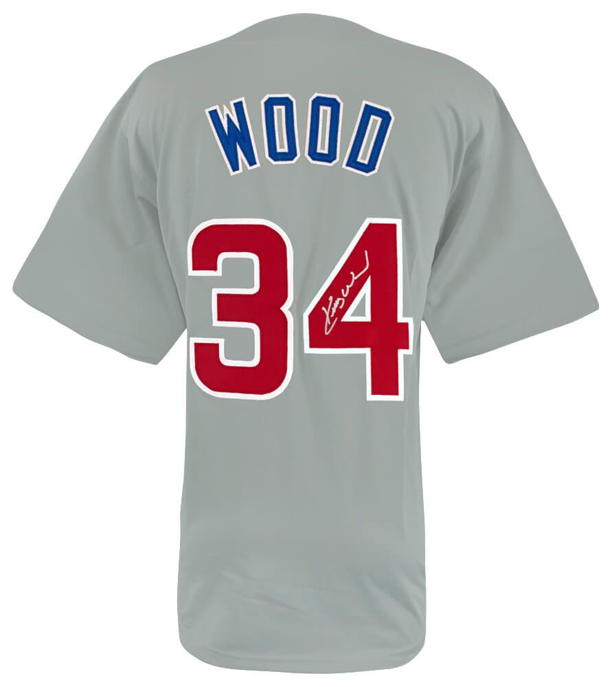 Custom jersey with everything sewn on, size XL. Hand-signed by Kerry Wood.