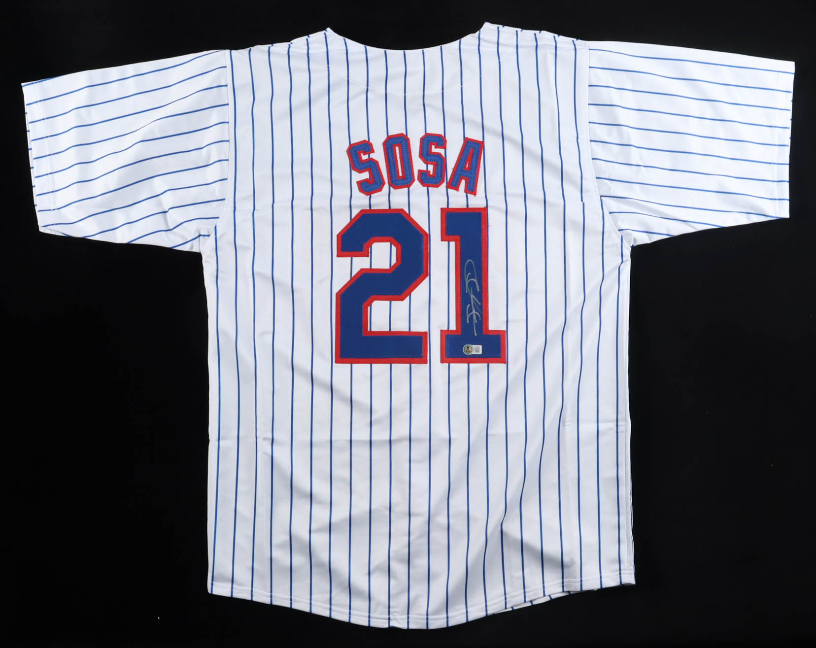 Custom jersey with everything sewn on, size XL. Hand-signed by Sammy Sosa.