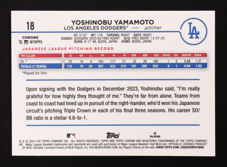 Yoshinobu Yamamoto 2024 Topps Chrome Prism Refractors #18 RC
