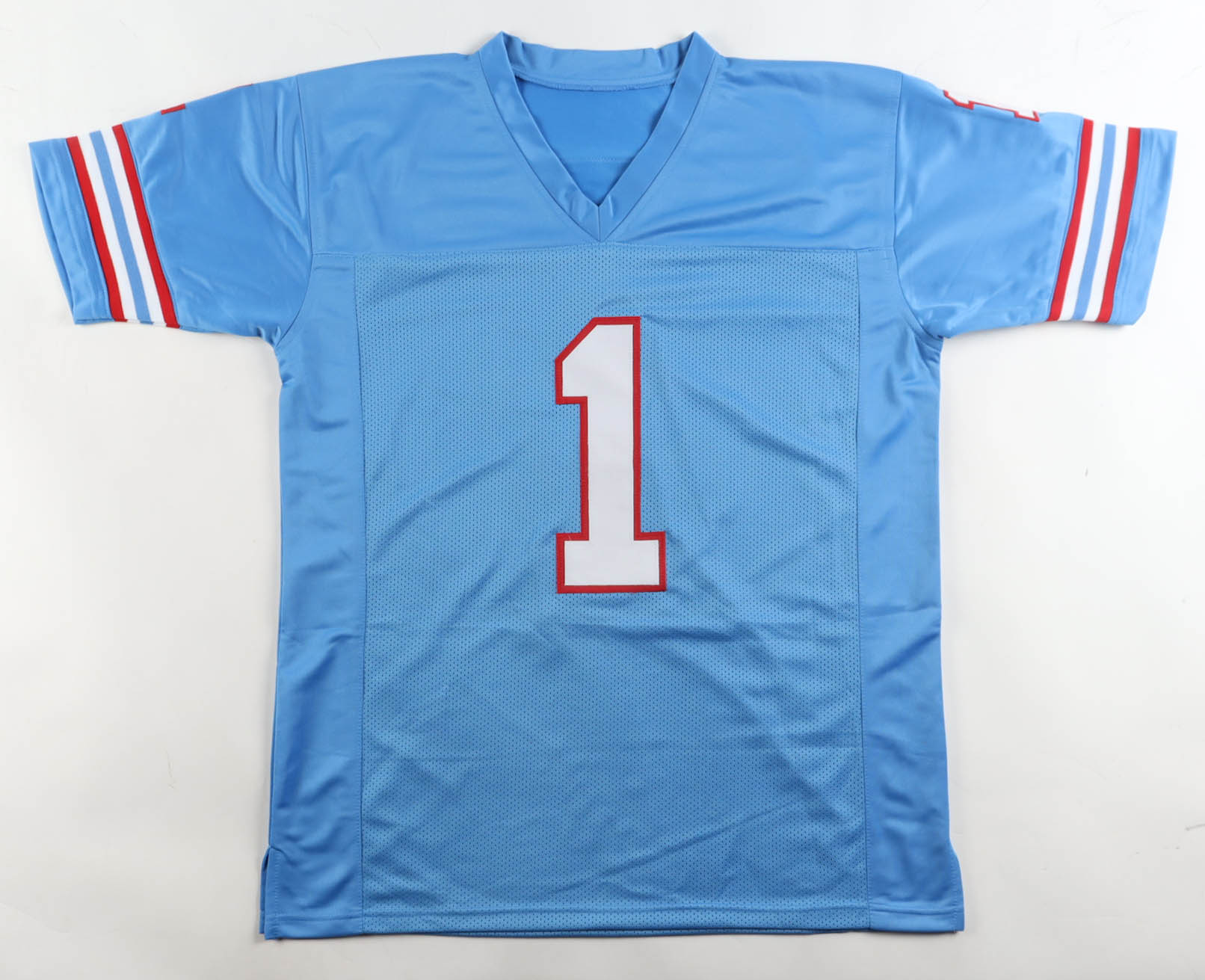 Custom jersey with everything sewn on, size XL. Hand-signed and inscribed by Warren Moon (HOF).