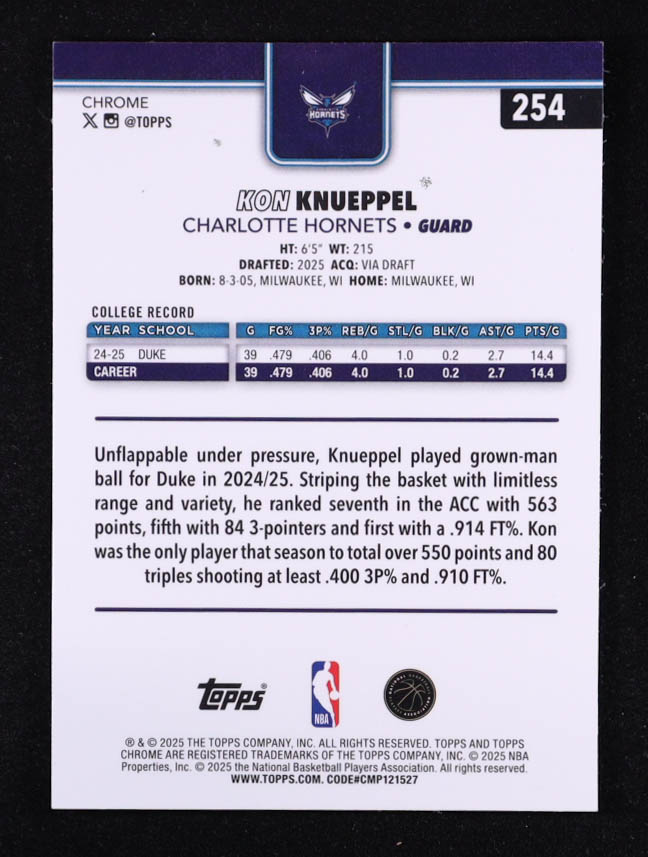 Kon Knueppel 2025-26 Topps Chrome #254 RC