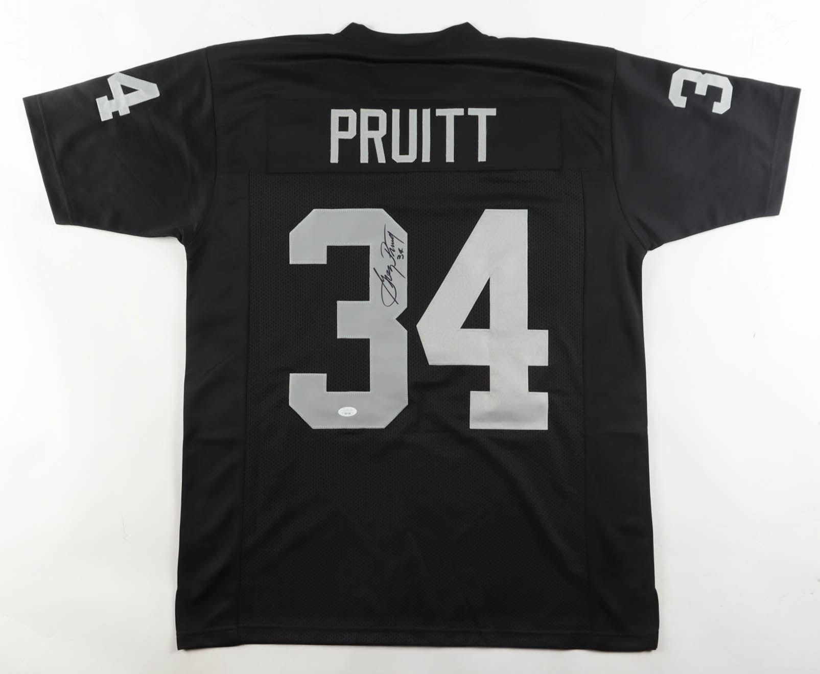 Custom jersey with everything sewn on, size XL. Hand-signed by Greg Pruitt.