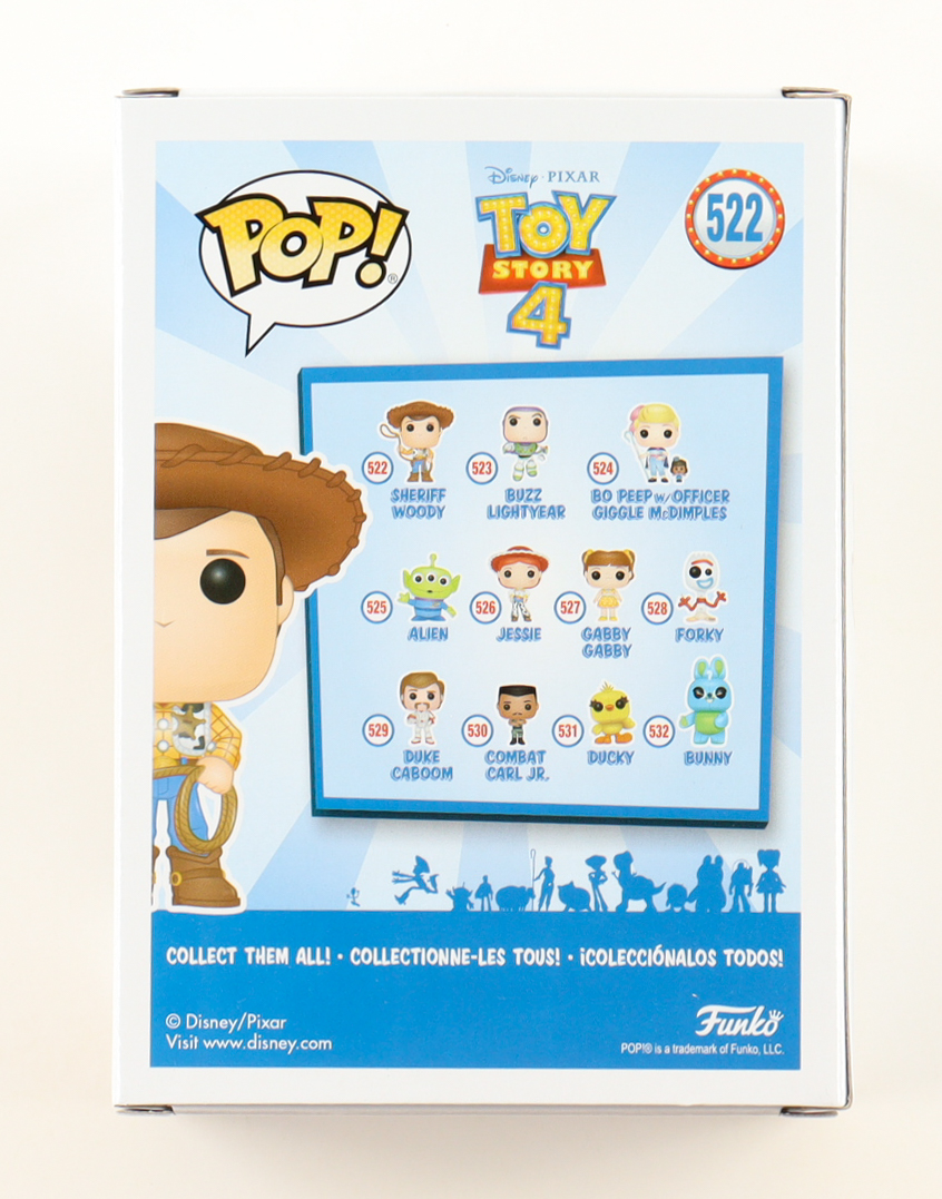 Funko Pop! vinyl figure measures approximately 4" in height. Hand-signed on the packaging by Tom Hanks (Woody). Please note the window has been swapped.