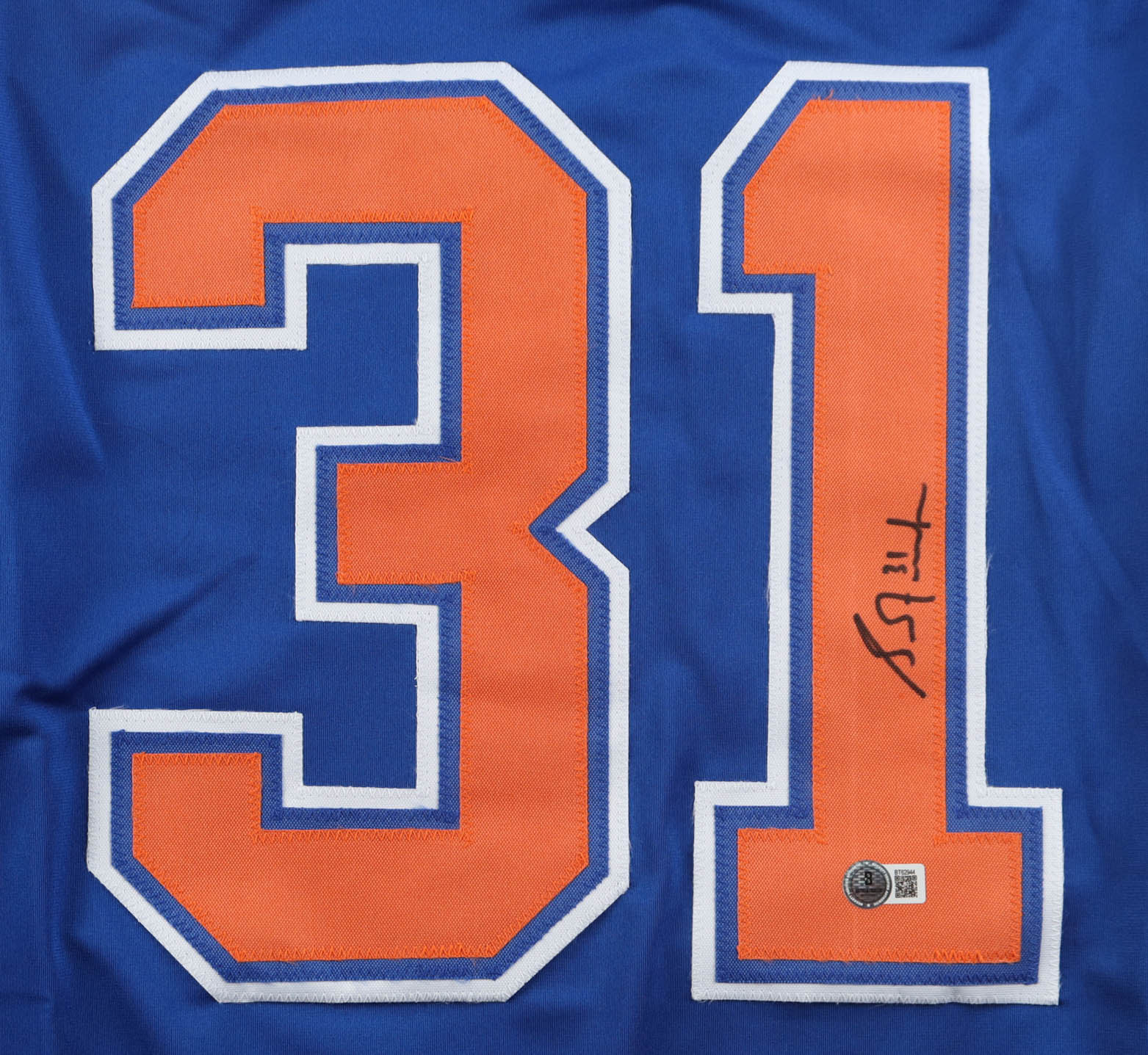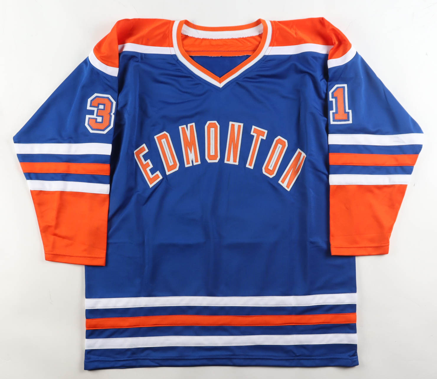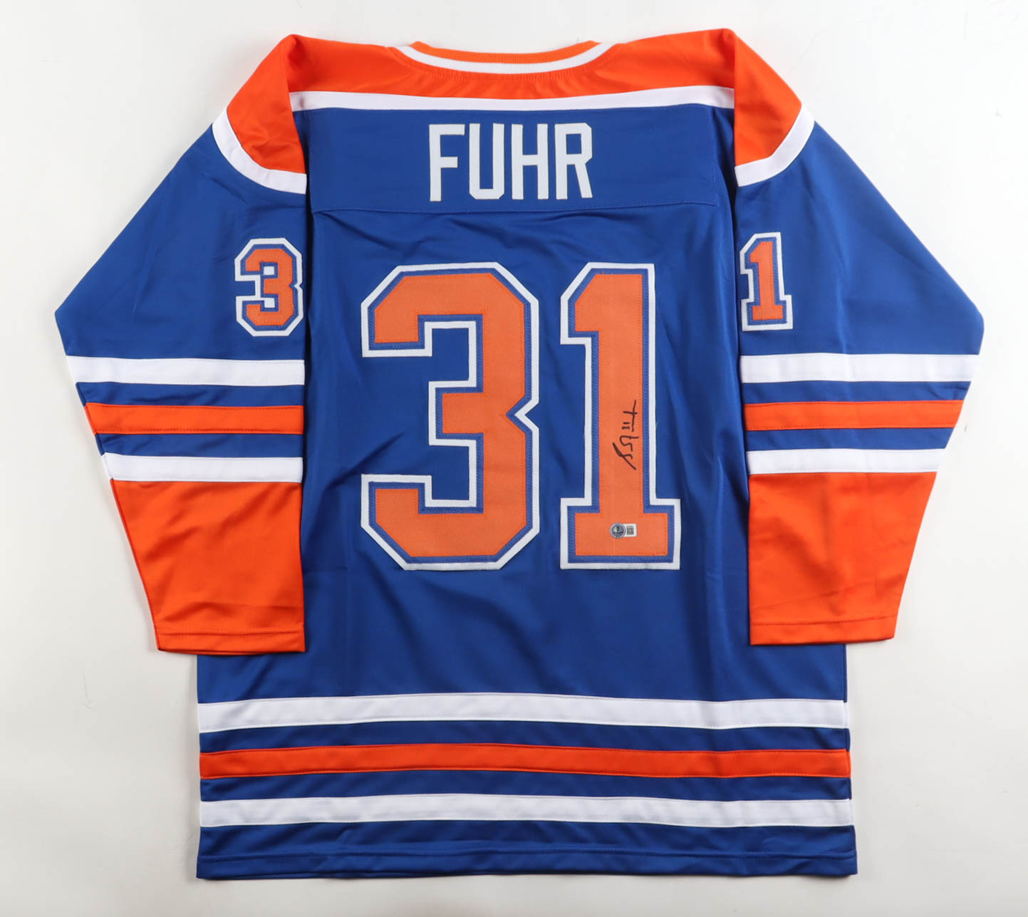 Custom jersey with everything sewn on, size XL. Hand-signed by Grant Fuhr (HOF).