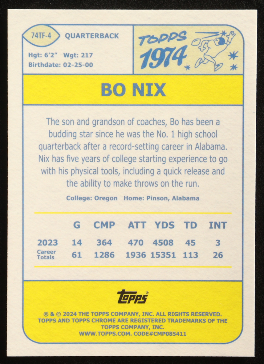 Bo Nix 2024 Topps Chrome '74 Topps Pink Refactors #74TF4 RC