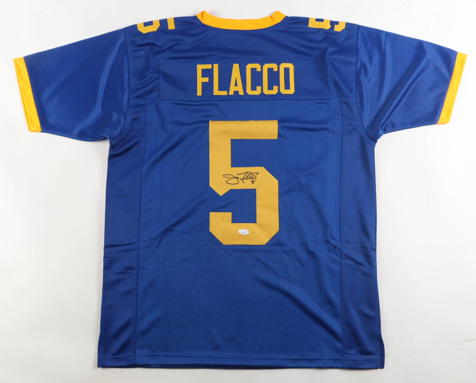 Custom jersey with everything sewn on, size XL. Hand-signed by Joe Flacco.
