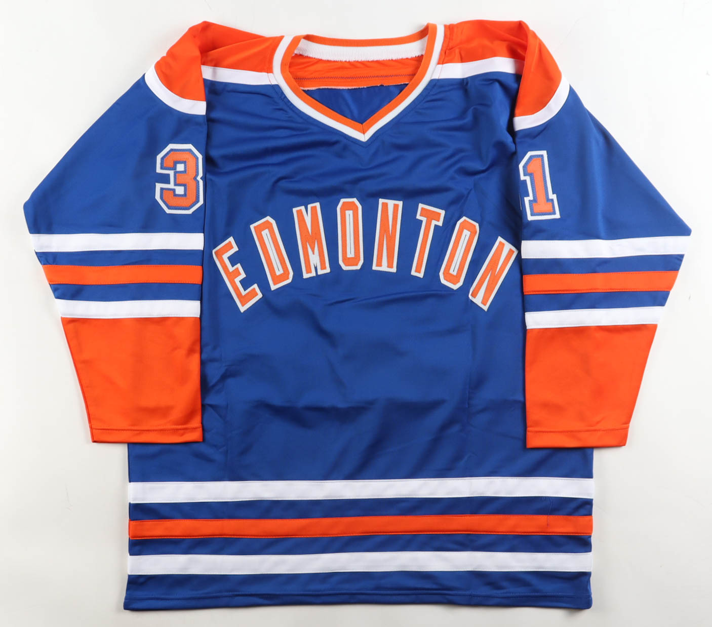 Custom jersey with everything sewn on, size XL. Hand-signed by Grant Fuhr (HOF).